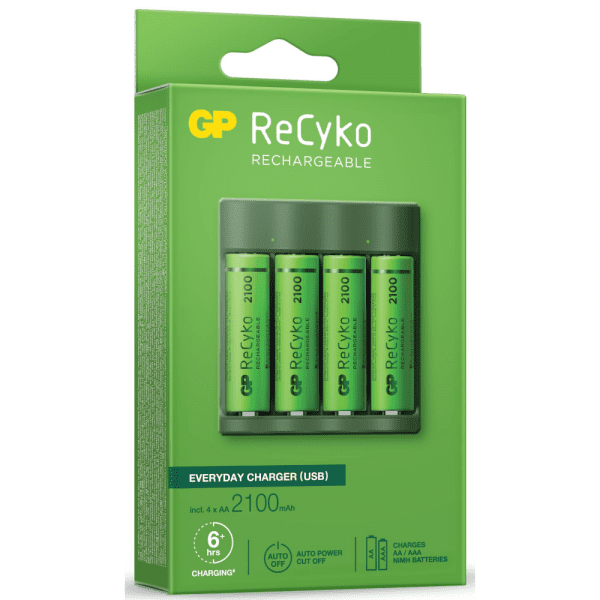 With four AA 2100mAh rechargeable batteries included, you’re good to go with this optimal charging solution. Charging times: AA NiMH 1300mAh – 2600mAh: 2 or 4 batteries in 4 – 8 Hours AAA NiMH 650mAh – 950mAh: 2 or 4 batteries in 2.5 – 3.5 Hours Features GP ReCyko 4 Slot NiMH USB Charger 2 LED Indicators Auto Cut Off when batteries fully charged Safety Protection: Timer Protection – 8hrs Temperature Cut off Led Indication: The Green LED will show for 0.5 second just after USB power input Green flashing LED – Charging in progress Green LED – fully charged Green LED Rapid Flashing – Bad battery or single use battery inserted