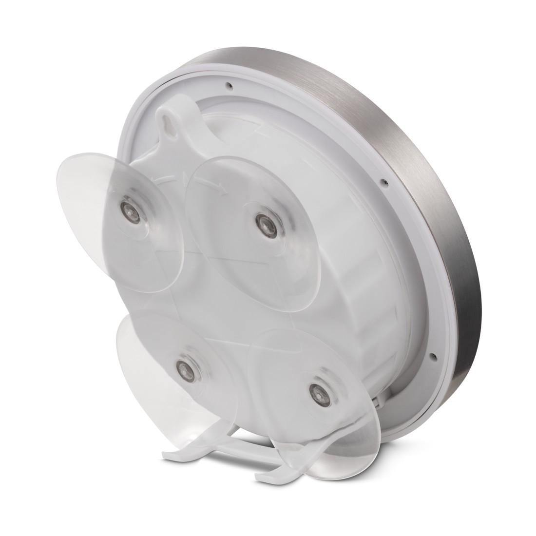 Аналогов кварцов часовник за баня Монтаж с вендузи, за гладки стени Устойчив на пръски Рамка изработена полиран алуминий Сребърни цветни часови и минутни стрелки Аналогов дисплей със сребристи стрелки Допълнителен отвор за закачне на гърба Батерии: 1 x AA
