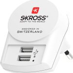 – Проектиран в Швейцария – Подходящ за всички страни с евро и шуко стандартни контакти – 2 USB порта за едновременно зареждане – 1 x Type-C USB изход: 5.0 V DC / Макс. 3.0 A, макс. 15.0 W 1 x Type-A USB изход: 5.0 V DC / Макс. 2.4 A, макс. 12.0 W Средна активна ефективност: 86.4 % Ефективност при ниско натоварване (10 %): 85.3 % Консумирана мощност без товар: 0.03 W – USB изход: Макс. Общо 27.0 W – Входно напрежение: 110 V – 240 V, 50/60 Hz, Макс. 40.0 W, макс. 700 mA – Съвместим с всички адаптери за пътуване SKROSS