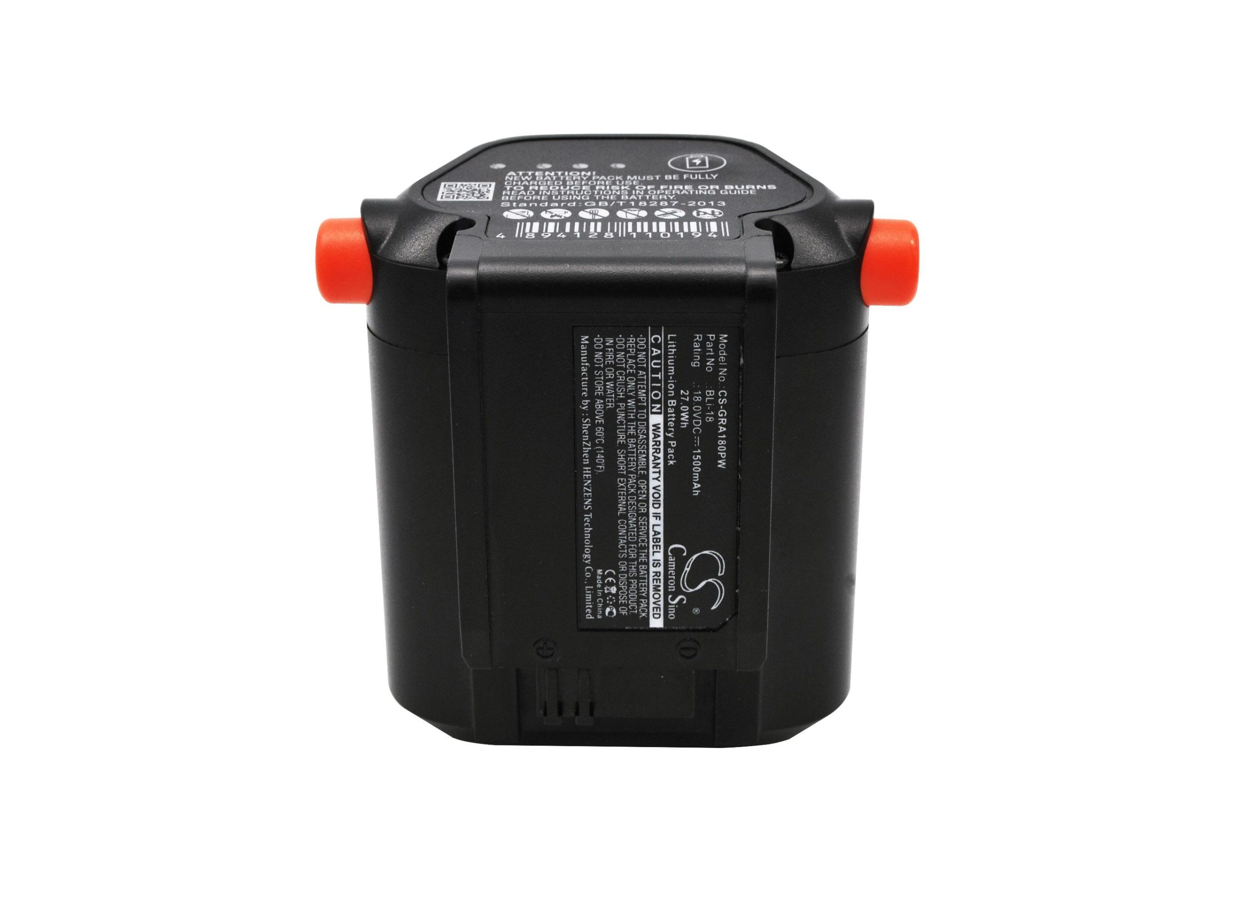 Item No.: CS-GRA180PW Type: Li-ion Capacity: 1500mAh / 27.00Wh Voltage: 18.0V Color: Black Dimension: 97.90 x 94.10 x 73.15mm EAN Code: 4894128110194 Net Weight: 385.0g / 13.58oz