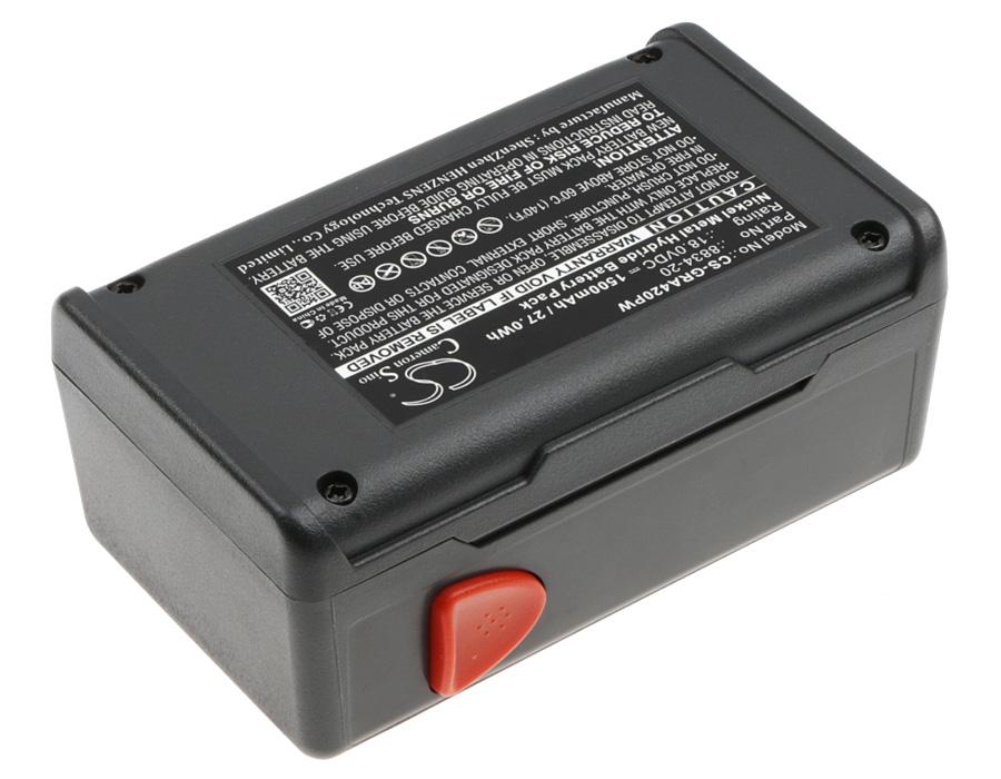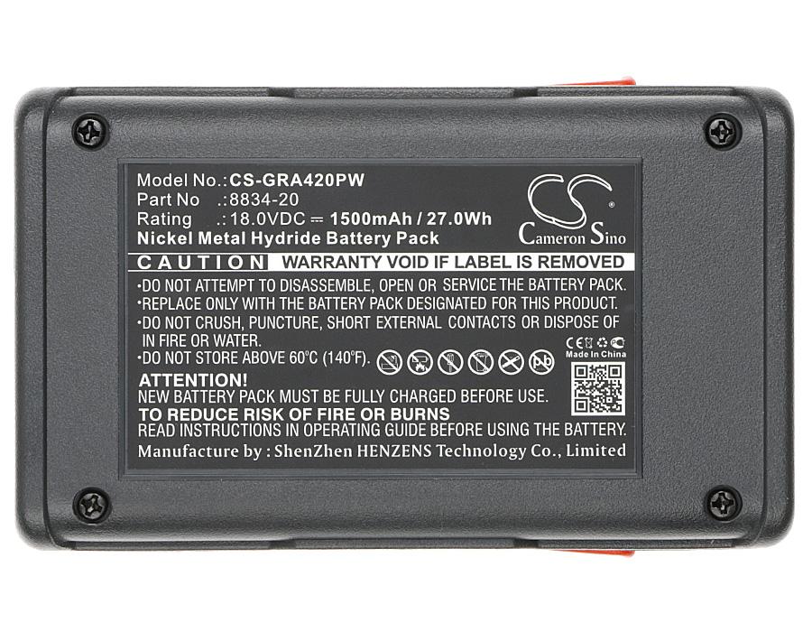 Item No.: CS-GRA420PW Type: Ni-MH Capacity: 1500mAh / 27.00Wh Voltage: 18.0V Color: Grey Dimension: 125.10 x 80.16 x 53.00mm EAN Code: 4894128113522 Net Weight: 489.0g / 17.25oz