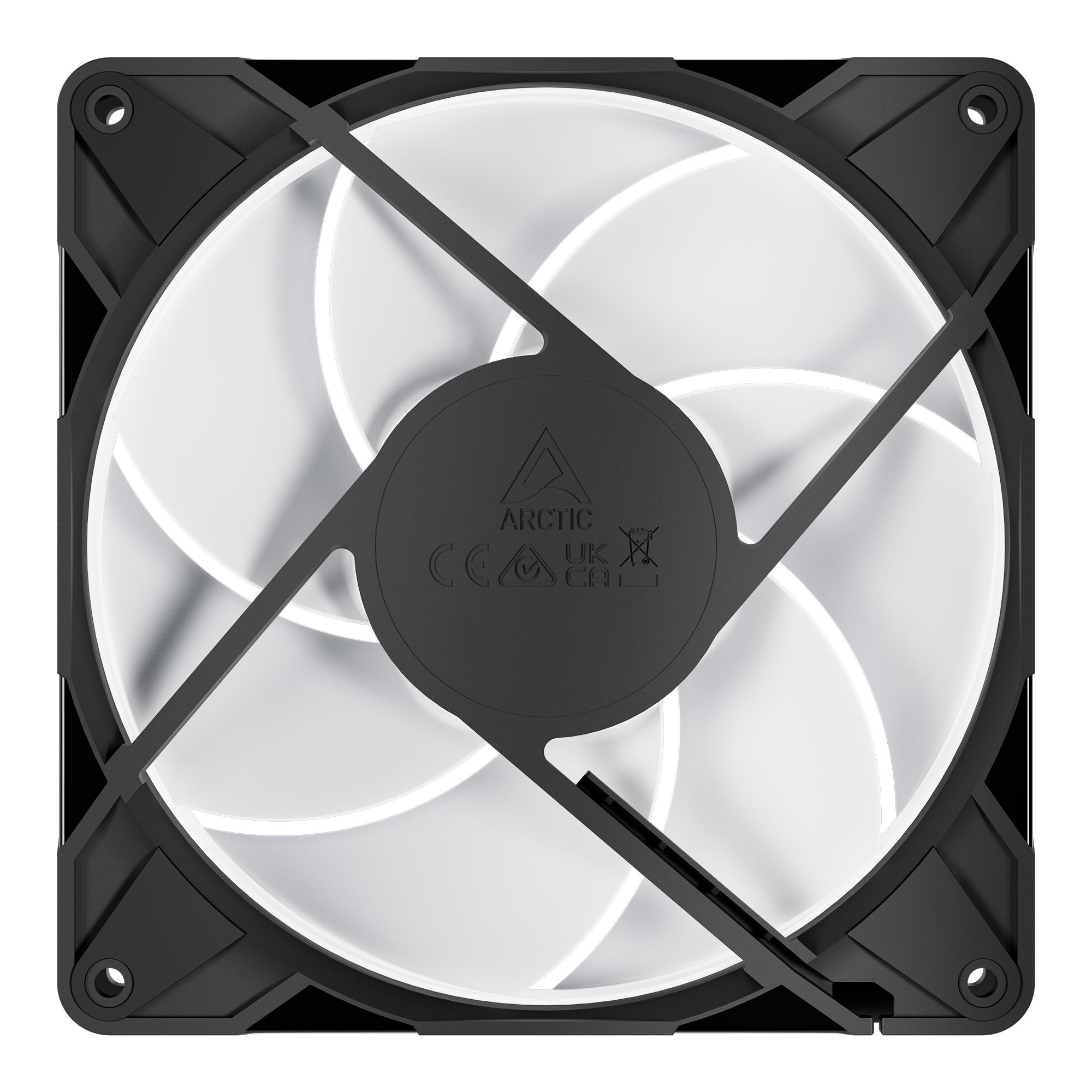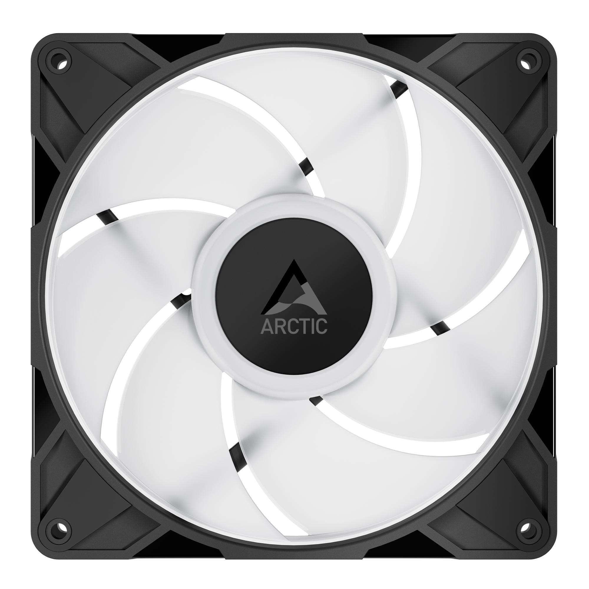 ARCTIC P14 Pro A-RGB е 140 мм вентилатор, който комбинира мощно охлаждане с впечатляващо адресируемо RGB осветление — идеален за геймърски конфигурации и системи с водно охлаждане. Основни характеристики Размер : 140 мм Обороти : 400–2500 RPM с PWM контрол Ниво на шум : до 25 dB(A) — тих дори при висока производителност Лагер : Fluid Dynamic Bearing (FDB) с удължен вал за по-малко вибрации и по-дълъг живот Конектор : 4-pin PWM + допълнителен A-RGB конектор за синхронизация на осветлението Гаранция : 6 години — доказателство за надеждност Производителност Високо статично налягане : идеален за радиатори, филтри и плътни панели Минимални разстояния между перките и рамката : за максимална ефективност Автоматичен двуосен баланс : намалява вибрациите и шума Микроконтролер от ново поколение : намалява шума от мотора и предпазва от токови удари и обратна полярност Осветление A-RGB ефекти : светлината излиза от центъра и равномерно осветява перките Силна яркост, но регулируема : видима дори през деня, но ненатрапчива през нощта Съвместимост : работи с повечето RGB контролери и дънни платки с A-RGB поддръжка