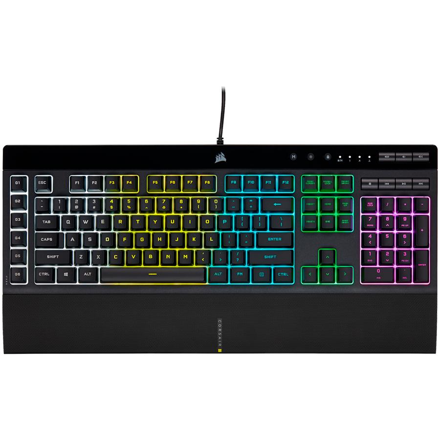 Corsair K55 RGB PRO – Мембранна геймърска клавиатура с RGB подсветка и макро бутони Corsair K55 RGB PRO е надеждна и достъпна геймърска клавиатура, създадена за комфортна игра и продуктивност. Снабдена с петзонова RGB подсветка , мембранни Rubber Dome суичове и шест програмируеми макро бутона , тя предлага тиха работа, визуална персонализация и функционалност за стрийминг или игри. Клавиатурата е устойчива на разливане благодарение на IP42 защита , а вградените мултимедийни контроли , подложката за китки и анти-ghosting технологията я правят идеален избор за геймъри, които търсят комфорт и стил без да преминават към механични решения. Характерни предимства Тиха работа с мембранни суичове – идеална за споделени пространства RGB подсветка в 5 зони – персонализиране чрез iCUE 6 макро бутона – за игри, стрийминг или продуктивност IP42 защита – устойчивост на прах и течности Мултимедийни контроли – лесен достъп до звук и възпроизвеждане Подложка за китки – включена за допълнителен комфорт Съвместимост с Elgato Stream Deck – за стрийминг интеграция Технически характеристики Тип клавиатура Мембранна геймърска клавиатура Суичове Rubber Dome – тихи, плавни Форм-фактор Full-size с допълнителни макро бутони Подсветка RGB – пет зони, с шест предварителни ефекта Макро бутони 6 – напълно програмируеми чрез iCUE или Elgato Stream Deck Мултимедийни контроли Да – отделни бутони за звук и възпроизвеждане Anti-Ghosting / Key Rollover 12-Key Selective с Anti-Ghosting Интерфейс USB 2.0 Type-A Вградена памет Да – за запазване на профили и настройки Подложка за китки Включена – фиксирана, ергономична Защита от разливане IP42 – устойчивост на прах и течности Регулируема височина Да – чрез крачета Размери 481 x 167 x 36 мм Тегло ~1.3 кг Съвместимост Windows 10/11, macOS 10.15+, USB порт, интернет за iCUE Софтуер Corsair iCUE – управление на подсветка, макроси, профили Цвят Черен