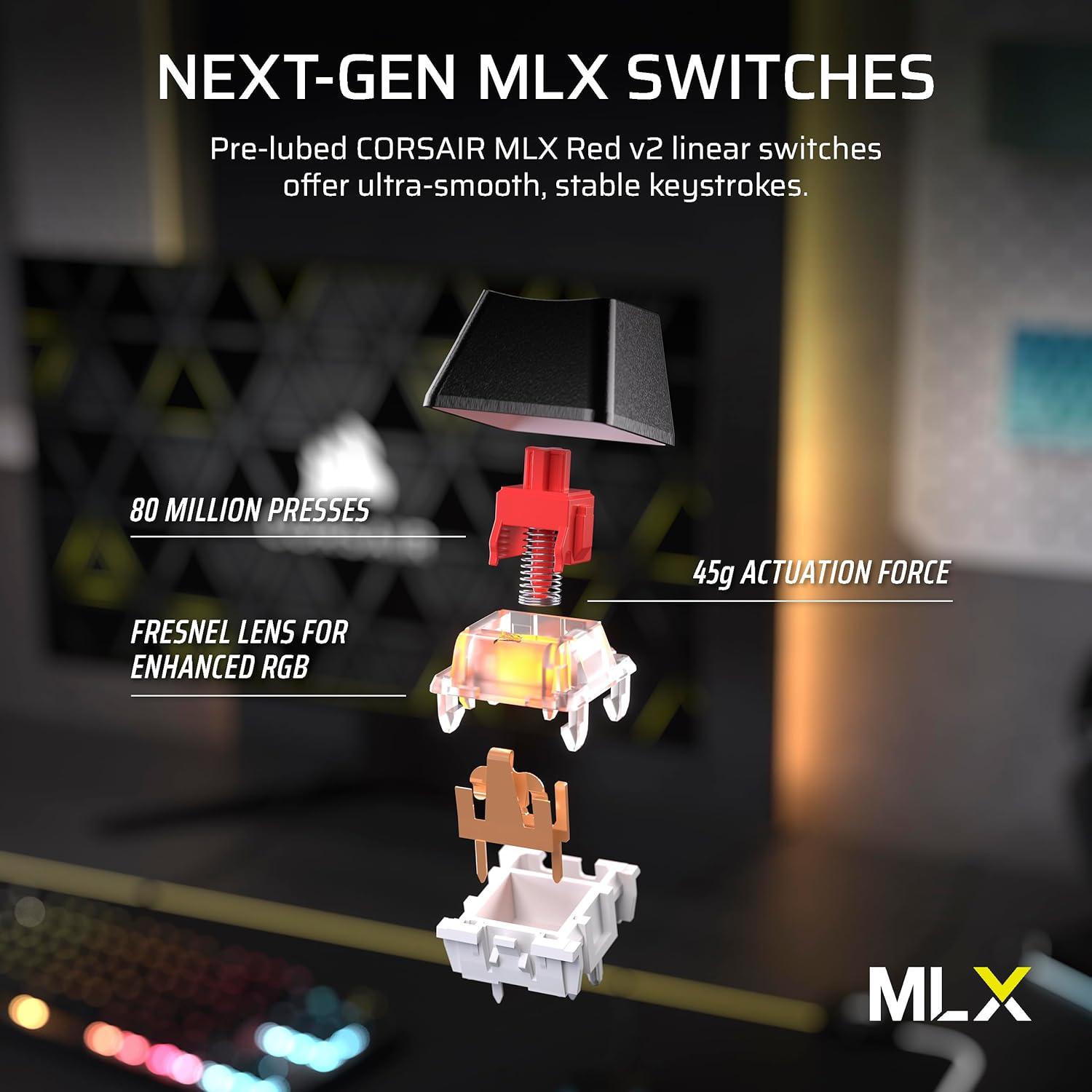 Тип клавиатура: Механична gaming клавиатура Конектор: USB Type-A Форм фактор: Tenkeyless (TKL) Брой клавиши: 87 Цвят: Черен Подсветка: RGB LED с персонализируеми ефекти Технически детайли Суичове: CORSAIR MLX Red v2 (линейни механични ключове) Polling rate: до 1000 Hz Anti-ghosting: Да (Full Key NKRO – всички клавиши регистрират едновременно) On-board памет: Да, до 5 профила (8 MB) Кабел: USB с гумена оплетка ( tangle-free ) Допълнителни функции Двойно стрелково RGB осветление , поддръжка и настройка чрез Corsair iCUE Въртящ мултифункционален контрол за аудио и медийни настройки Flash Tap технология – ускорено разпознаване на едновременно натискани клавиши ( SOCD control ) FN медийни клавиши и Win lock функция Регулируеми крачета за наклон