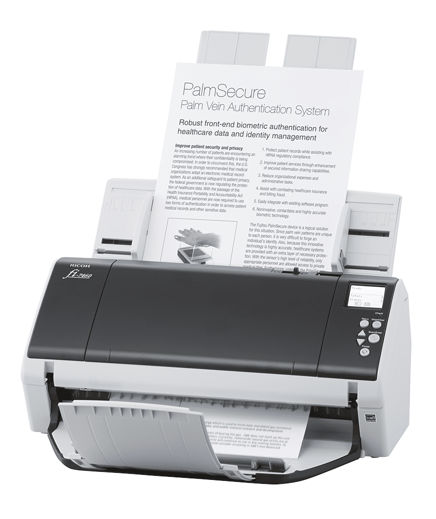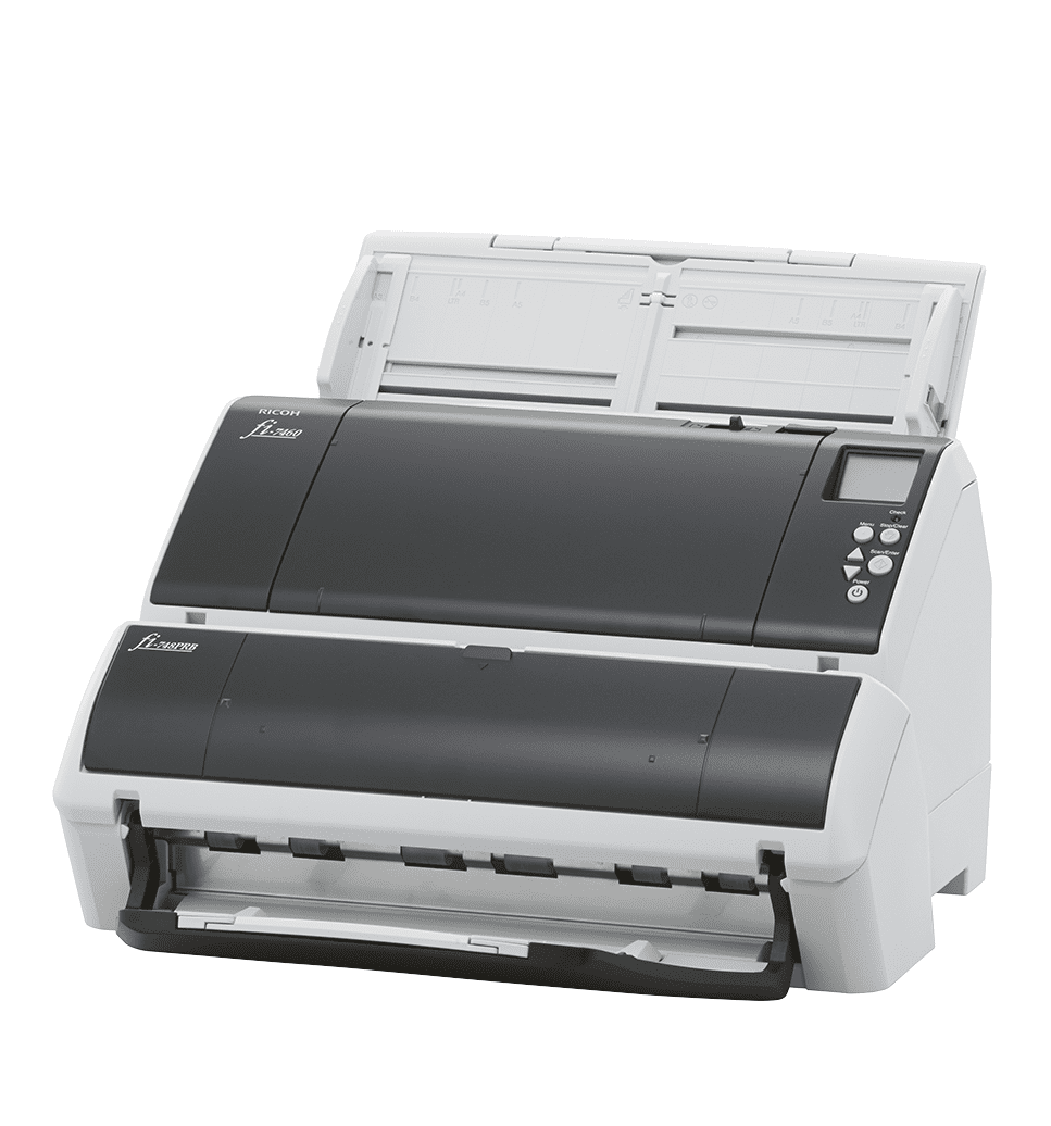 Ricoh скенер FI-7460 e с формат A3, способен да сканират дори документи с размер A2 и A1. Неговата гъвкава възможност за подаване обхваща обикновени размери A8 до A3 и се простира до сгънати документи A2 и A1, както и малки пластмасови карти. За максимална гъвкавост, непрекъснатото сканиране на смесени партиди елиминира необходимостта от предварително сортиране на документите. fi-7460 сканира с висока скорост от 60 ppm / 120 ipm. Вграденият ADF за подаване на хартия се справя надеждно с дебелина на хартията от 27 до 413 g/m2. Стотици документи могат да бъдат сканирани без прекъсване, благодарение на ADF за 100 листа (A4, 80 g/m2 ). Можете дори да добавяте още хартия, докато сканирате, или да събирате допълнителни документи в една и съща процедура за сканиране и записване във файл. Това е възможно благодарение на технологиите Intelligent Sonic Paper Protection (iSOP) и Ricoh fi Series Skew Reducer ,които правят сканирането на смесени партиди на работния плот изключително лесно. Софтуер: PaperStream IP, PaperStream Capture, ABBYY® FineReader for ScanSnap™, Scanner Central Admin, 2D Barcode Module, Linux driver Технически характеристики Дневно натоварване: високо, подходящ за професионални среди Скорост Едностранно сканиране: 60 ppm Двустранно сканиране: 120 ipm ADF (автоматично подаване ) Капацитет: 100 листа (A4, 80 g/m²) Поддържана дебелина: 27 – 413 g/m² Непрекъснато подаване: възможно, включително добавяне на листове по време на работа Размери на документите Минимален размер: A8 Максимален размер: A3 Сгънати документи: A2 и A1 Пластмасови карти: поддържани Качество на изображението Технология: PFU Clear Image Capture Резолюция: до 600 dpi Корекции: намаляване на изкривяване, стабилизиране на цветове Защита на документите iSOP – Intelligent Sonic Paper Protection Skew Reducer – намаляване на накланянето Интерфейси USB Софтуер PaperStream IP PaperStream Capture ABBYY® FineReader for ScanSnap™ Scanner Central Admin 2D Barcode Module Linux driver