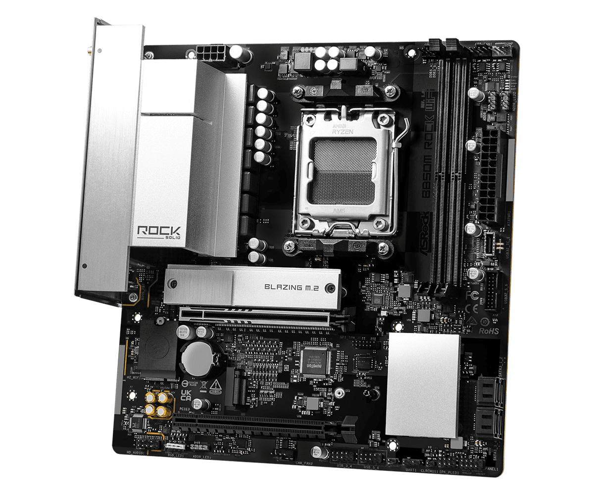 ASRock B850M ROCK WiFi предлага силна производителност, поддръжка на DDR5, PCIe Gen5 възможности и бърза безжична свързаност. Нейният изчистен дизайн и балансиран набор от функции я правят отличен избор за компактни геймърски или работни конфигурации. CPU поддръжка – Съвместима с AMD Ryzen 7000, 8000 и 9000 Series процесори на AM5 сокет. Памет – Поддържа високоскоростна DDR5 памет в 4 DIMM слота за плавна работа и силна производителност. Захранване – Ефективен VRM дизайн, осигуряващ стабилно подаване на мощност за модерни многоядрени процесори. Разширения – Разполага с PCIe 5.0 x16 слот за видеокарти от следващо поколение и допълнителни PCIe опции. Сторидж – Включва няколко M.2 слота (с поддръжка на PCIe Gen5) плюс SATA портове за гъвкави сторидж конфигурации. Свързаност – Оборудвана с WiFi 7 и 2.5GbE LAN за бърза, надеждна и модерна мрежова комуникация. USB портове – Предлага широк набор от USB‑C и USB 3.2 портове за съвременни периферни устройства. Дизайн – Изчистен ROCK стил, подходящ за компактни и производителни PC системи.