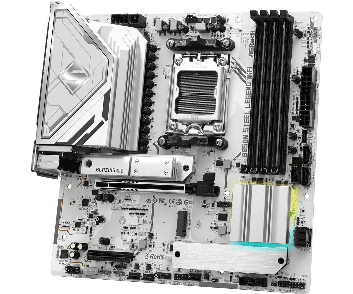 ASRock B850M Steel Legend WiFi7 предлага стабилно захранване, поддръжка на PCIe Gen5, бърза DDR5 памет и най‑новото поколение безжична свързаност. Белият Steel Legend дизайн я прави отличен избор за стилни, ефективни и бъдещоподготвени конфигурации. CPU поддръжка – Съвместима с AMD Ryzen 7000, 8000 и 9000 Series процесори на AM5 сокет, осигурявайки широки възможности за ъпгрейд. Памет – Поддържа DDR5 с честоти до 8000+ (OC) в 4 DIMM слота за високопроизводителни конфигурации. Захранване – 12+2+1 VRM дизайн за стабилна работа при гейминг и продуктивни натоварвания. Разширения – Разполага с PCIe 5.0 x16 за видеокарти от ново поколение и допълнителни PCIe слотове. Сторидж – Оборудвана с 3 M.2 слота (PCIe 5.0 x4, PCIe 4.0 x4, PCIe 4.0 x2) плюс 4 SATA порта за разнообразни сторидж решения. Свързаност – Включва WiFi 7, Bluetooth 5.4 и 2.5GbE LAN за изключително бърза мрежова комуникация. USB портове – Богат избор от USB 3.2 високоскоростни портове за модерни периферни устройства. Аудио – Използва Realtek ALC1220 за чист и висококачествен звук.