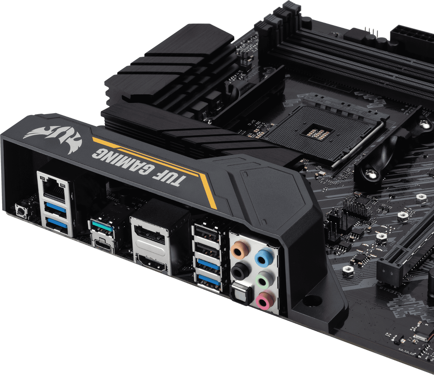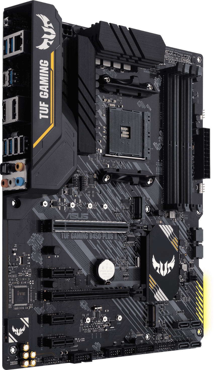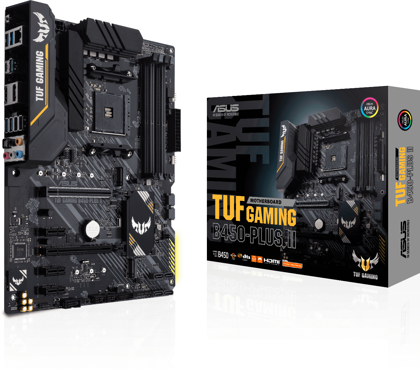 Дънна платка ASUS TUF GAMING B450-PLUS II, socket AM4, ATX, dual M.2, 4x DDR4, Aura Sync RGB, AI Noise-Canceling AMD B450 (AM4) ATX дънна платка за игри с два M.2 слота, AI шумопотискащ микрофон, HDMI, DisplayPort, USB 3.2 Gen 2 Type-A и Type-C и Aura Sync RGB поддръжка на осветление