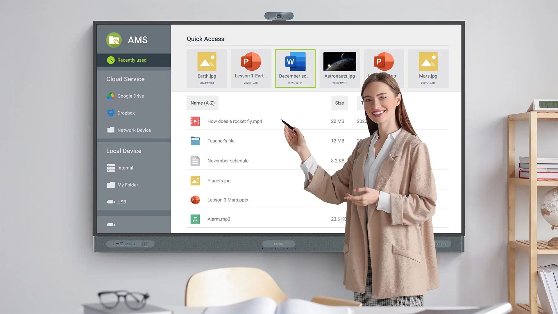 Устойчив на микроби екран с писалка и дистанционно Вграден йонизатор за чист въздух 2 x 20W високоговорителя със субуфер Влизане с NFC с едно докосване за незабавно зареждане на материали за уроци Интерактивни инструменти за преподаване за повече практически уроци Панел: Размер на екрана: 65″ Тип панел: IPS Разделителна способност: UHD 3840 x 2160 пиксела Активна площ: 1428.5 x 803.5 mm Съотношение на страните: 16:9 Яркост без стъкло (типично): 450 нита Контраст (типично): 1200:1 Динамичен контраст: 50000:1 Дълбочина на цвета: 10 бита Време за реакция: 8 ms Цветова гама: 72% NTSC Време за работа: 18 часа / 7 дни Ориентация: Пейзаж Стъкло: Закалено (9H) Покритие устойчиво на микроби (Нано-йонно сребро) Покритие против отблясъци: Да Тъч скрийн: Сензорна технология: Infrared Точки на допир: до 40 Време за реакция: < 10 ms Система: Процесор: Arm Cortex-A78 × 4 + A55 × 4 Графичен процесор: Arm Mali-G57 MC5 Памет / Съхранение: 8GB и 128GB ОС: Android 13 EDLA Свързване: HDMI (вход / изход): 4 × HDMI 2.0 | 1 × HDMI 2.0 DisplayPort (вход / изход): 1 × 1.2a VGA:1 3.5 mm Линеен вход (1): микрофон x 1 3.5 mm Линеен вход (2): PC Audio × 1 3.5 mm Линеен изход: слушалка x 1 SPDIF (вход / изход): 1 (оптичен) USB-A: 7 × 3.0, 1 × 2.0 USB-B (for touch): 3 × 3.0 USB-C: 1 × 3.0 (PD 100 W), 2 × 3.0, 1 × 2.0 (PD 65 W) PC със слот (OPS): 1 Ethernet LAN: 2 RS-232: 1 Вградени периферни устройства: Микрофон: 8 (макс. обхват 8 м) Високоговорители: 2 x 20 W Субуфер: 1 x 16 W Сензори: Сензор за околна светлина : Да Сензор за инфрачервено лъчение: Да Сензор за въздух: CO₂, PM₂.₅, PM₁₀, TVOC, CH₂O, температура, влажност Сензор за движение: 1 NFC сензор: Да Wi-Fi6, Bluetooth 5.2: Вградени Йонизатор на въздуха: 1 Включен софтуер: Whiteboarding EZWrite 6.0; Wireless screen sharing InstaShare 2; Device management DMS; Account management AMS; Quick access tool Floating Tool; Broadcast system X-Sign Broadcast; Flicker Free – Yes; Low Blue Light – Yes