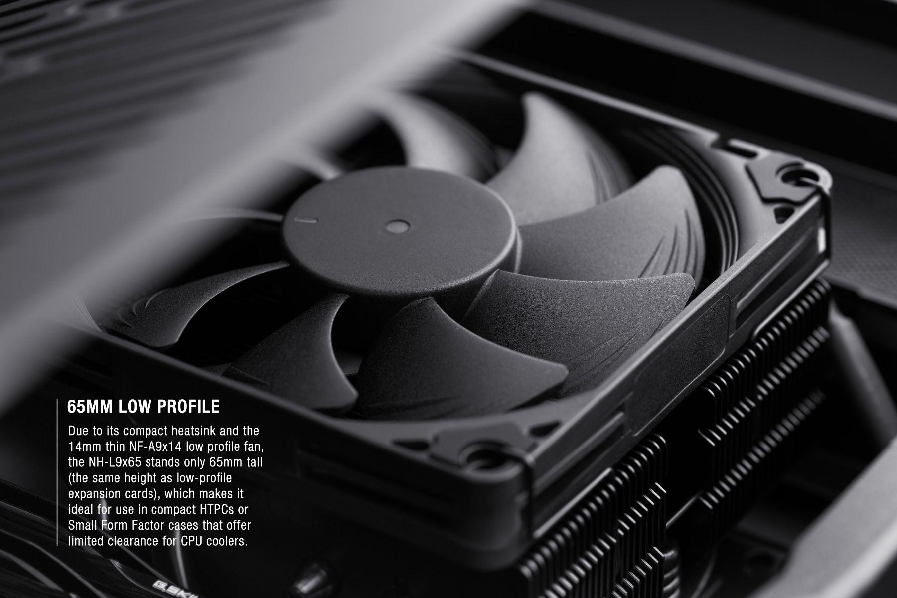 Охладител за процесор Noctua NH-L9x65 chromax.black – LGA1851/1700/1200/AM5 Съвместимост: Intel LGA1851, LGA1700, LGA1200, LGA1156, LGA1155, LGA1151, LGA1150 si AMD AM5, AM4 Размери: 65 x 95 x 95 mm Размер на вентилатора: 1 x 92 mm Оборoти на вентилатора: 600 – 2500 RPM Конектор: 4 pin