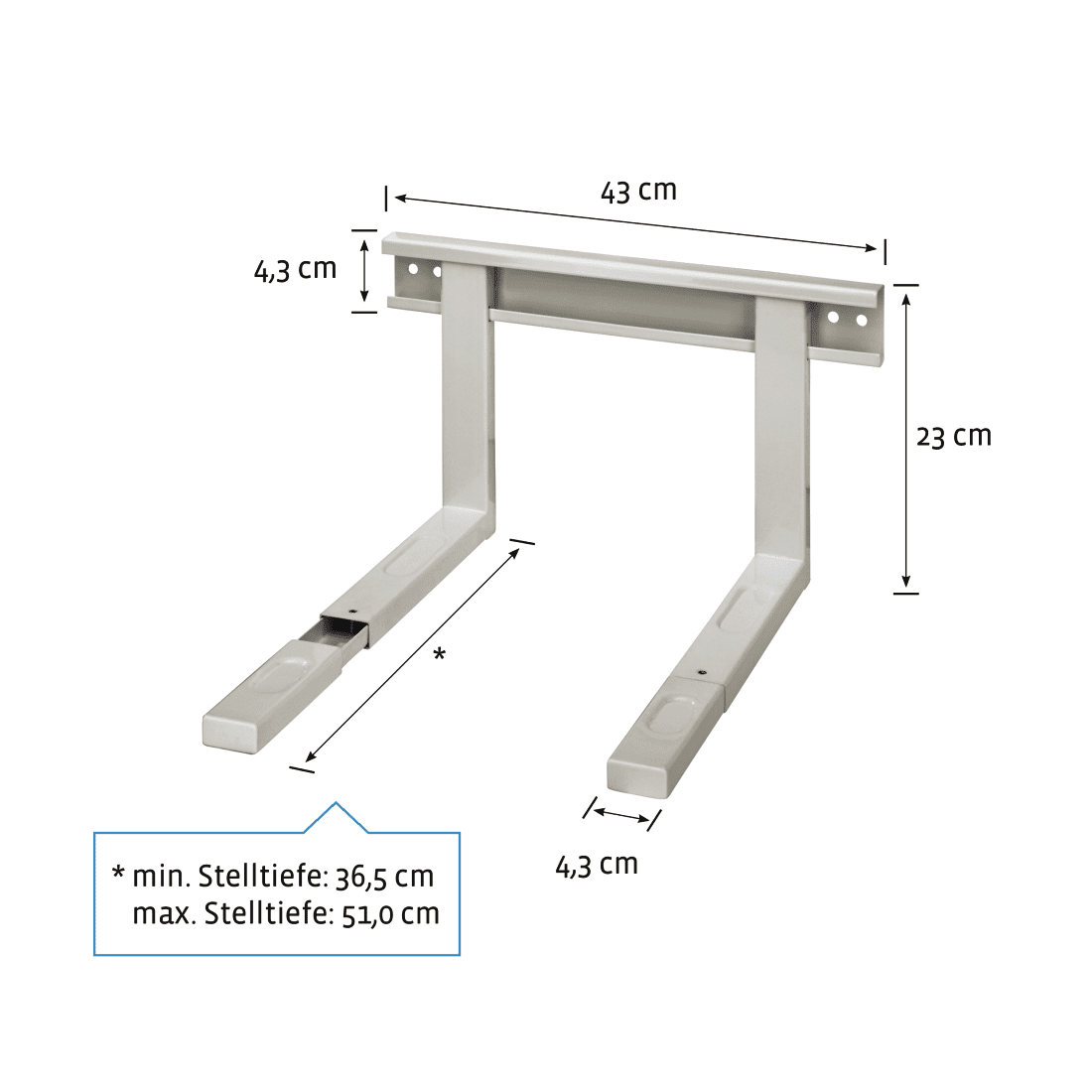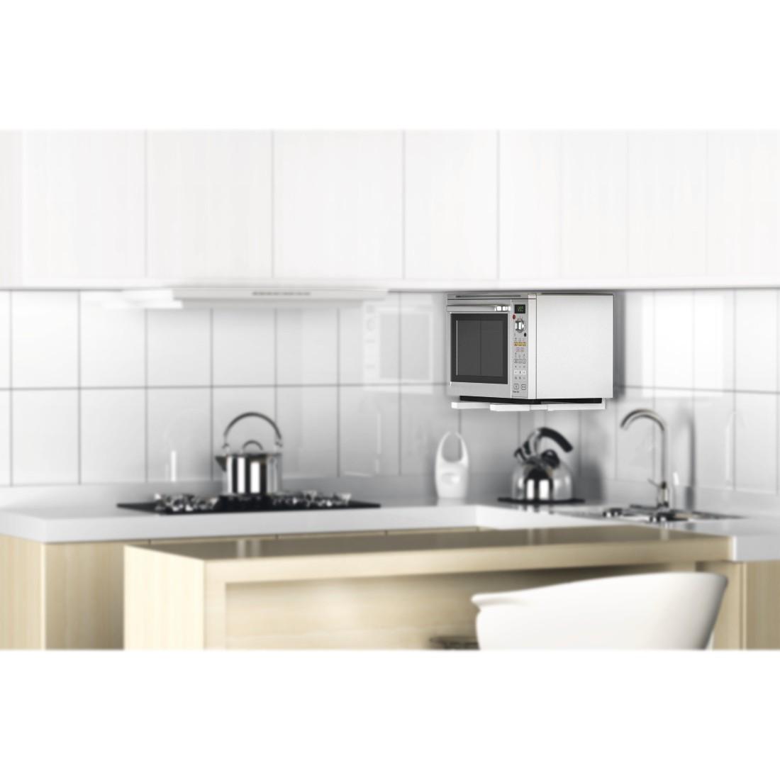 – Универсална стойка за микровълнова фурна – Лесна за монтаж – Ширината и дълбочината може да се регулира – Макс. товароносимост: 30 кг – Макс. ширина: 43 см – С разтегателни рамена от 36,5 – 51 см (дълбочина)