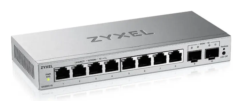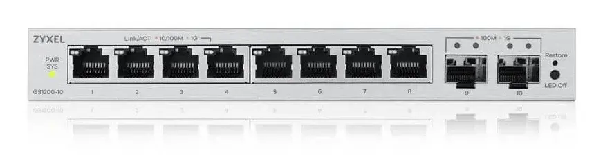 Zyxel GS1200-10 v3 е компактен управляем (web-managed) Layer 2 суич, предназначен за малки офиси и бизнес среди, които изискват стабилна и гъвкава мрежова инфраструктура. Разполага с 8 Gigabit LAN порта и 2 SFP uplink слота за свързване към оптична мрежа или backbone. Моделът предлага лесно управление през уеб интерфейс, поддръжка на VLAN, QoS и IGMP Snooping, което го прави подходящ за сегментиране на трафик и оптимизация на мрежата. Безвентилаторният дизайн осигурява тиха работа и надеждност при продължителна експлоатация. Основни характеристики: 8 x Gigabit Ethernet порта (RJ45) 2 x SFP слота за uplink Web-managed (лесно управление през браузър) Поддръжка на VLAN (802.1Q) QoS за приоритизиране на трафика IGMP Snooping (оптимизация на мултикаст) Безшумен (fanless) дизайн Подходящ за малки и средни мрежи Технически характеристики: Марка: Zyxel Модел: GS1200-10 v3 Партиден номер: GS1200-10V3-EU0101F Категория: Мрежов суич Тип: Managed (Web Smart) Layer: L2 Портове: 8 x RJ45 (10/100/1000 Mbps) 2 x SFP (Gigabit uplink) Производителност: Switching капацитет: 20 Gbps Forwarding rate: 14.88 Mpps MAC таблица: 4K адреса Мрежови стандарти: IEEE 802.3 / 802.3u / 802.3ab IEEE 802.3x (Flow Control) IEEE 802.3az (Energy Efficient Ethernet) IEEE 802.1Q (VLAN) IEEE 802.1p (QoS) Функции: VLAN (Port-based и tagging) QoS (WRR приоритизация) Port mirroring IGMP Snooping Broadcast storm control Jumbo Frames до 15 KB Захранване: Външно (100–240V AC)