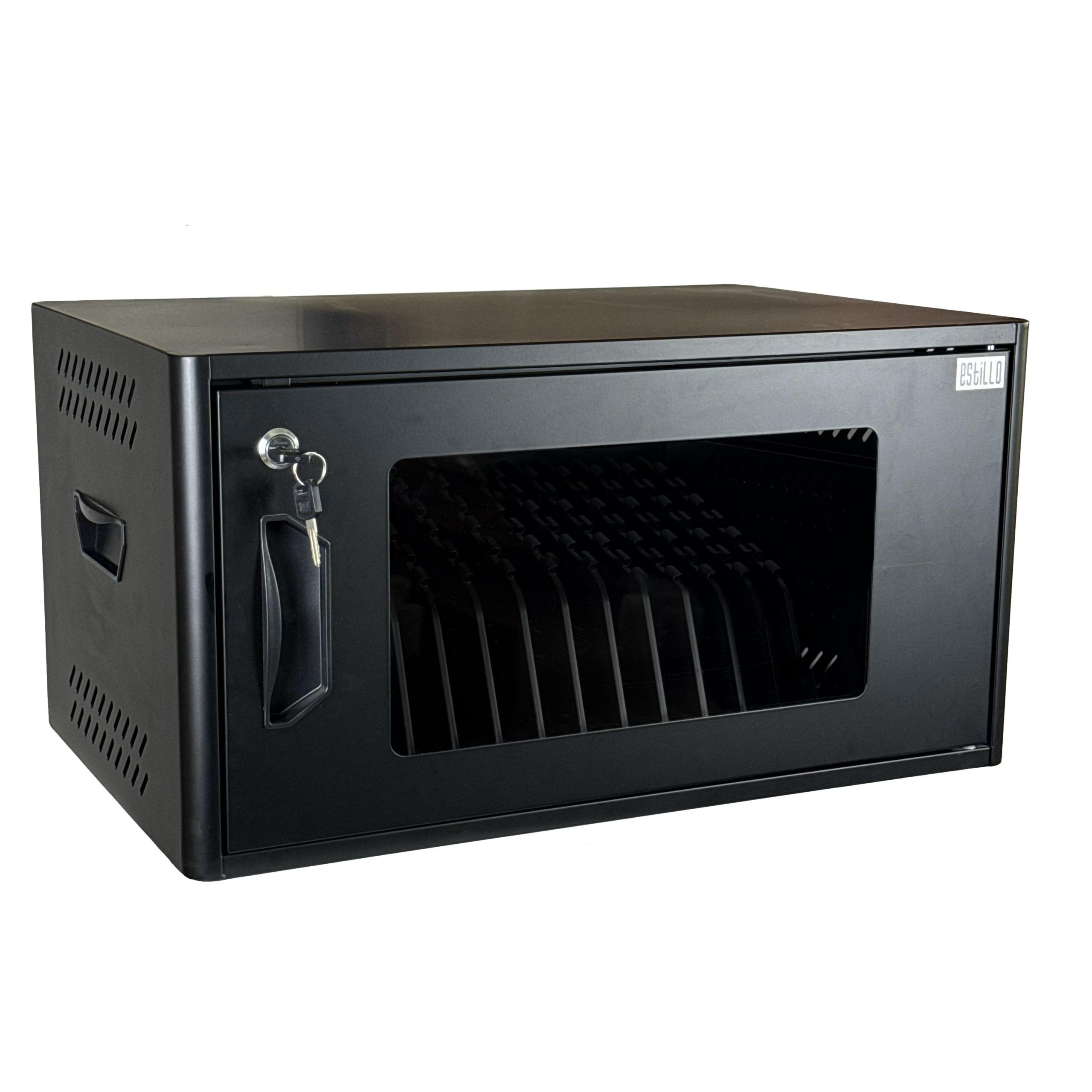 Шкаф, подходяща за монтаж на бюро или стена с размери 464 x 375 x 307mm Капацитет за съхранение и зареждане – 12 таблета или iPad. Стоманени разделители с PVC покритие. Всяко отделение е с размери 25 х 295 х 295 мм. 12 контакта за зареждане. Ключалка с ключ