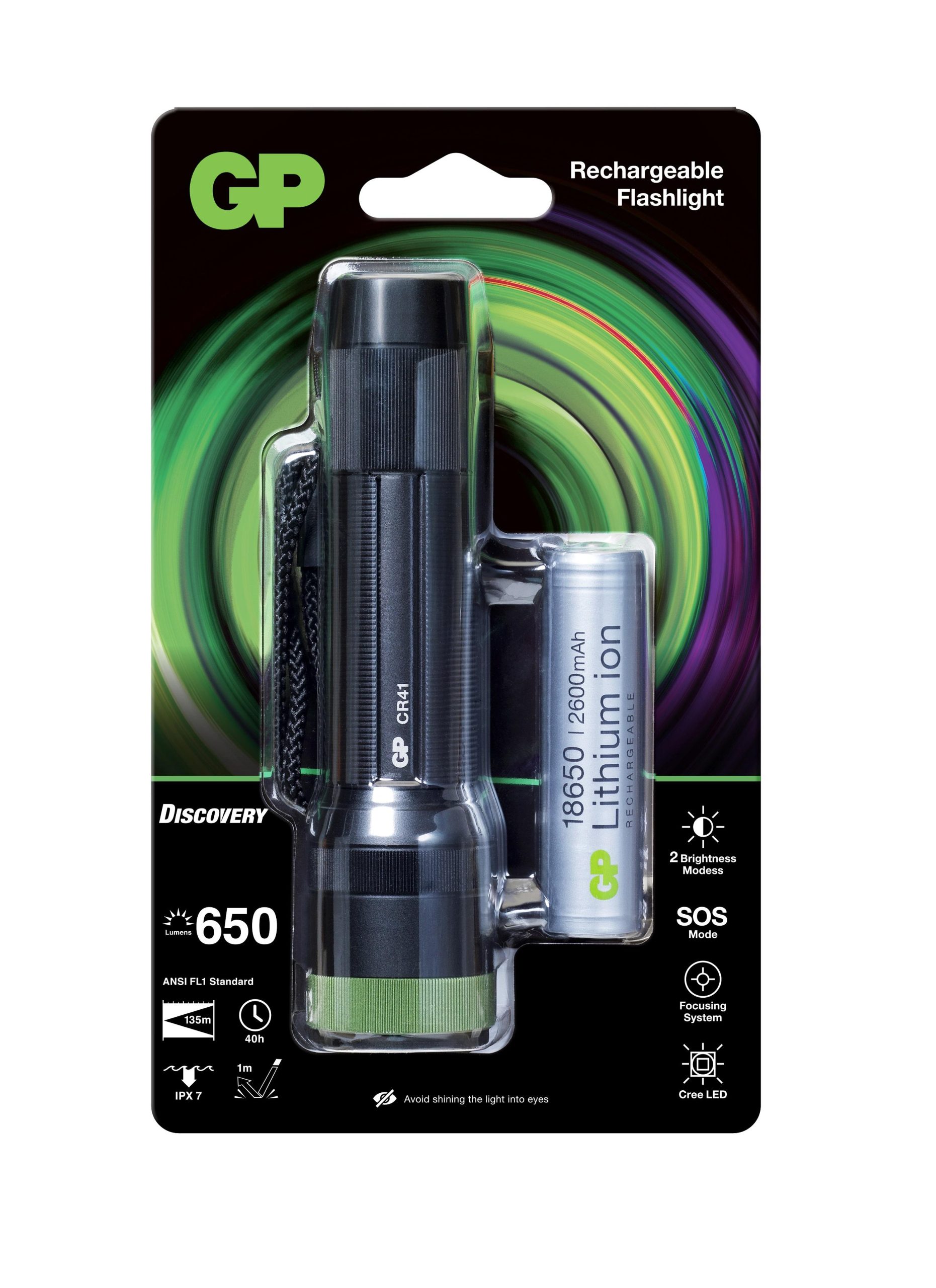 Technical Specifications: • ANSI FL1 standard: Lumens: 650 lumens Beam distance: 135 meters Run time: 40 hours Shock proof: 1 meter Water proof: IPX7 • Beam type: Adjustable Flood & Spot • LED chips: Cree • Dimension: Ø33 x 136 mm • Weight (with batteries): 179g (approx.) • In the pack: Flashlight x 1; 18650 lithium battery x 1; Safety instruciton & instruction manual