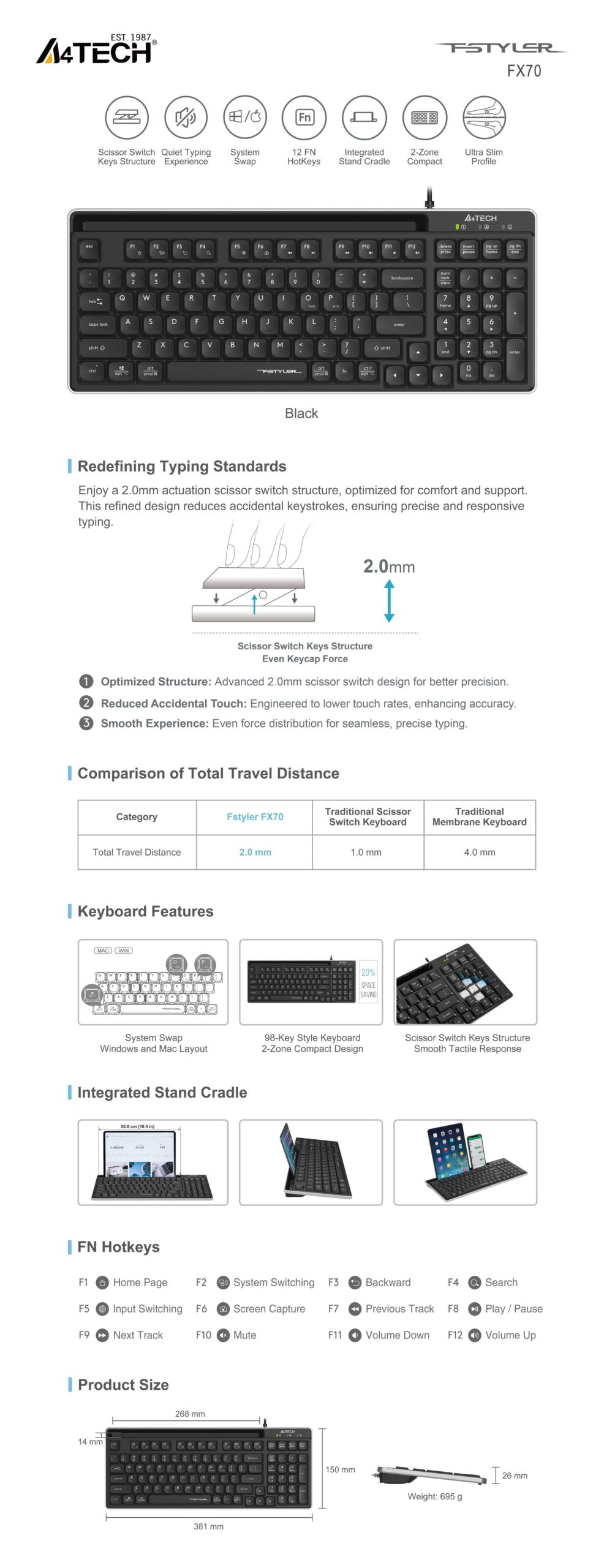 A4tech Fstyler FX70 Жична клавиатура, ниско профилна, ножична технология, кирилизирана, черна