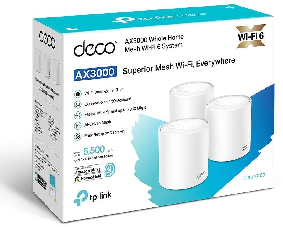 AX3000 Dual Band Wi-Fi 6 – Супер бърз Wi-Fi 6 със скорости до 3,0 Gbps 4 потока, по-малко забавяне – 2×2/HE160 2402 Mbps + 2×2 574 Mbps Скорост на Gigabit Wired – 3× Gigabit порта осигуряват достатъчна свързаност Повишено безпроблемно покритие – Безпроблемно Mesh Wi-Fi покритие до 600 m² (3 модула) AI-Driven Mesh – интелигентно изучава мрежовата среда, за да осигури идеален Wi-Fi, уникален за вашия дом TP-Link HomeShield – Осигурява цялостна защита на мрежата, стабилен родителски контрол и IoT защита в реално време Настройката е по-лесна от всякога – Приложението Deco ви превежда през настройката стъпка по стъпка
