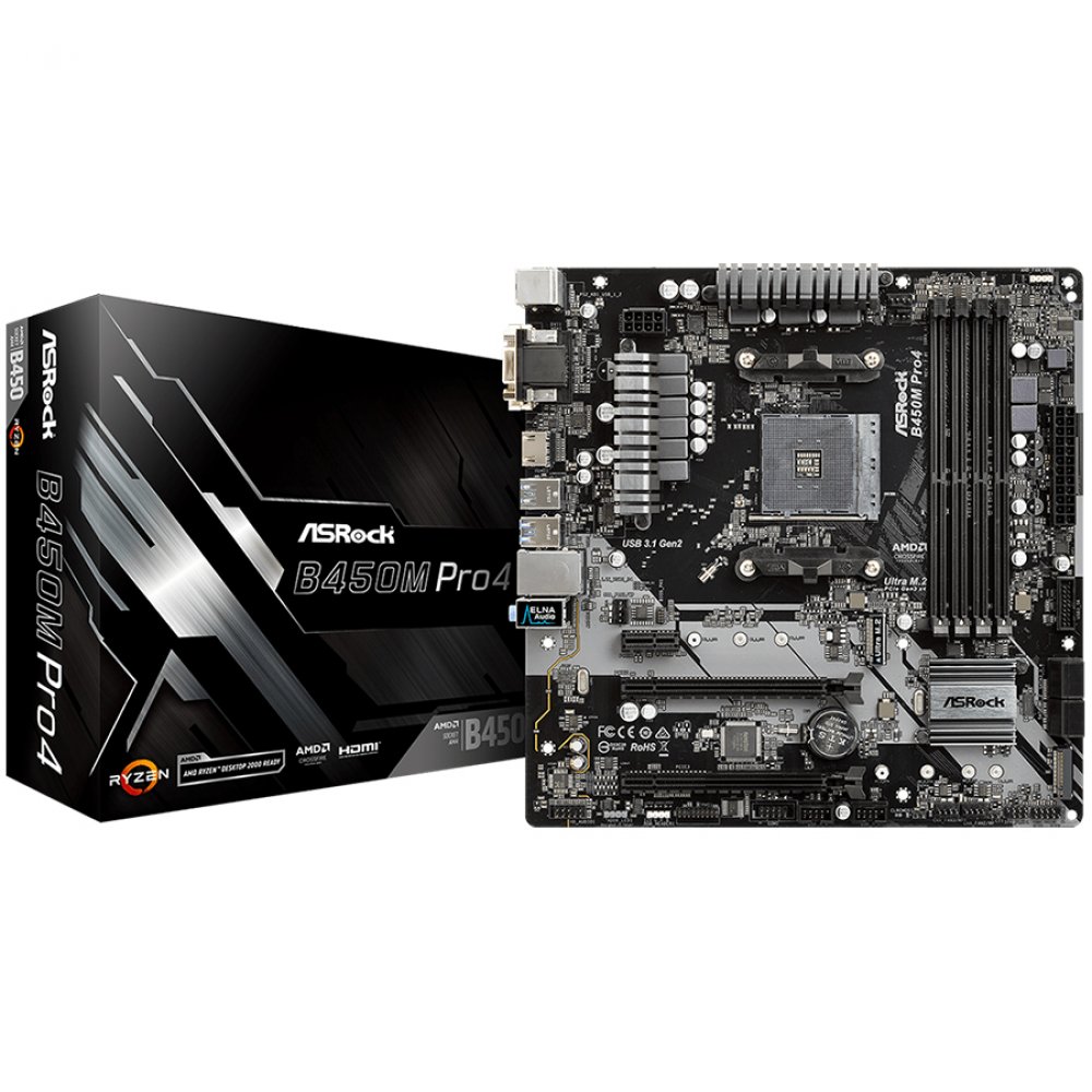 ASROCK Main Board Desktop B450M PRO4 (AM4 B450, 4xDDR4,PCIe 3.0 x16,PCIe 2.0 x1, M.2, 4 SATA3, Type -C, 7 USB,VGA, DVI, HDMI) mATX