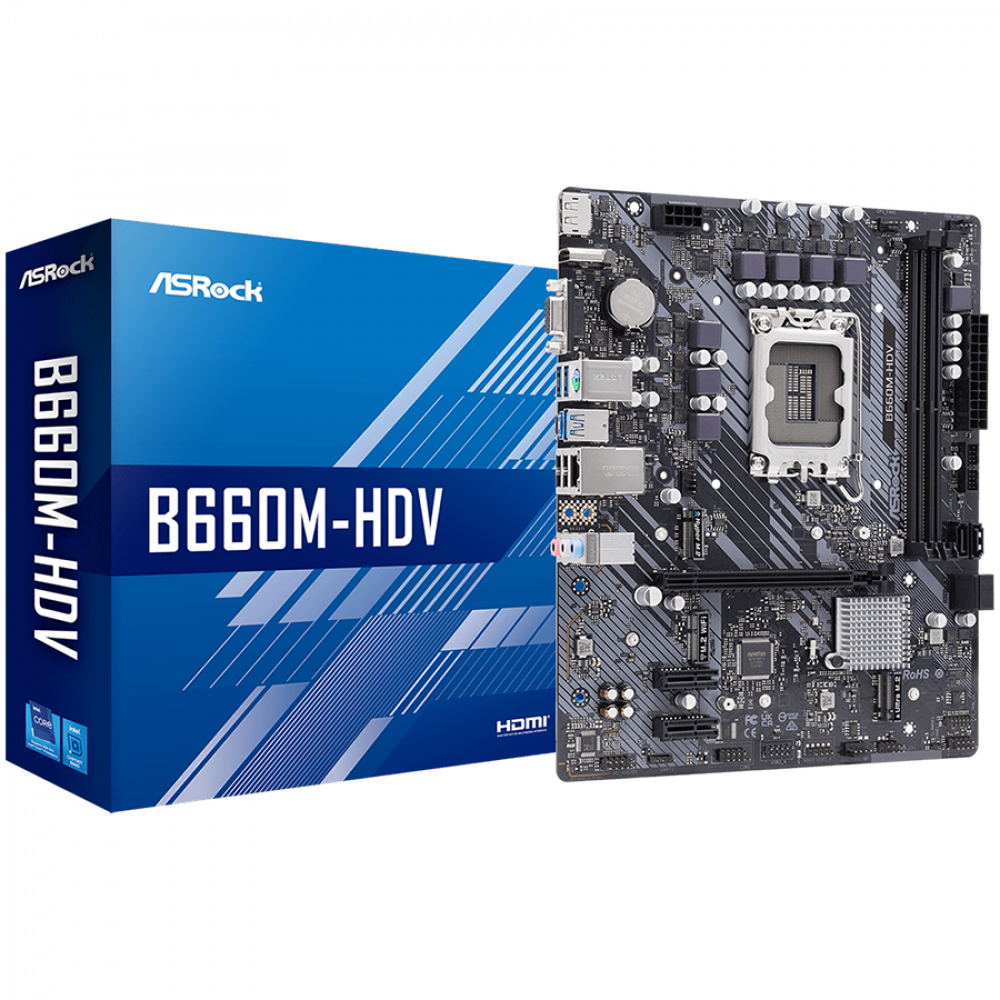 ASROCK Main Board Desktop B660M-HDV (S1700, 2x DDR4, 1x PCIe x16, 2x PCIe x1, 4x SATA3 6.0Gb/s, 1x m.2 PCIe, 5x USB 3.2, 1x USB-C, 5x USB 2.0, 1x Com port header, 1x VGA, 1x HDMI, 1x DP 1.4, GLAN, mATX) Retail