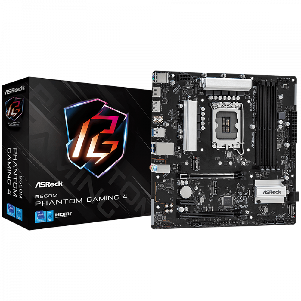 ASROCK MB Desktop B660M Phantom Gaming 4 (S1700, B660M, 4xDDR4, 2x PCIe x16, 1x PCIe 3×1, 4xSATA, 2xM.2 PCIe, 6x USB 3.2, 6x USB 2.0, DP, HDMI, GLAN, mATX) Retail.