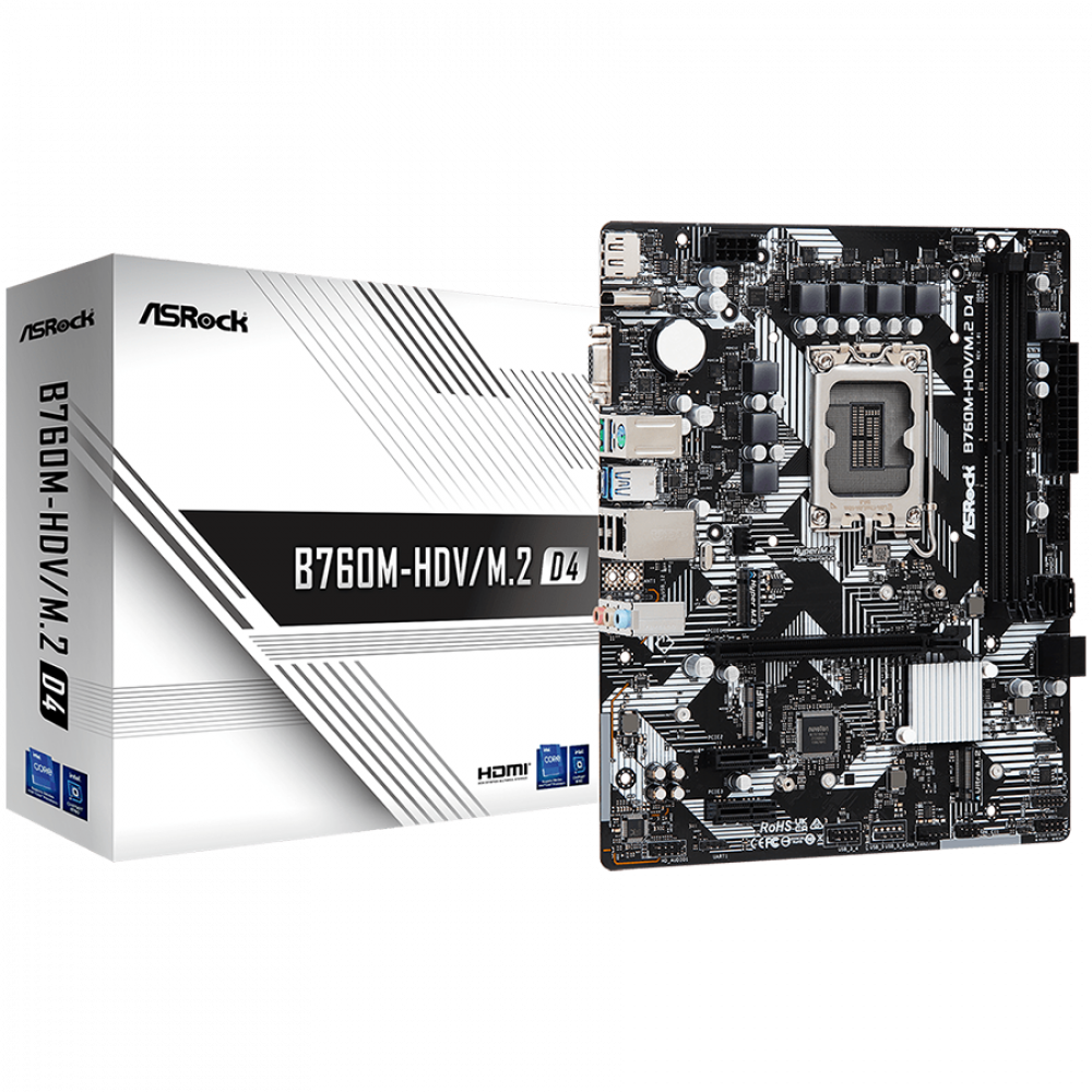 ASROCK MB Desktop B760M-HDV/M.2 D4 (S1700, 2x DDR4, 1x PCIe 4.0 x16, 2x PCIe 3.0 x1, 1x Hyper M.2 PCIe Gen4x4, 1x M.2 Ultra Gen3x4, 4x SATA3, 1x USB-C, 5x USB 3.2, 5x USB 2.0, 1xRJ-45 1Gbit, 1x VGA, 1x HDMI, 1x DP, mATX