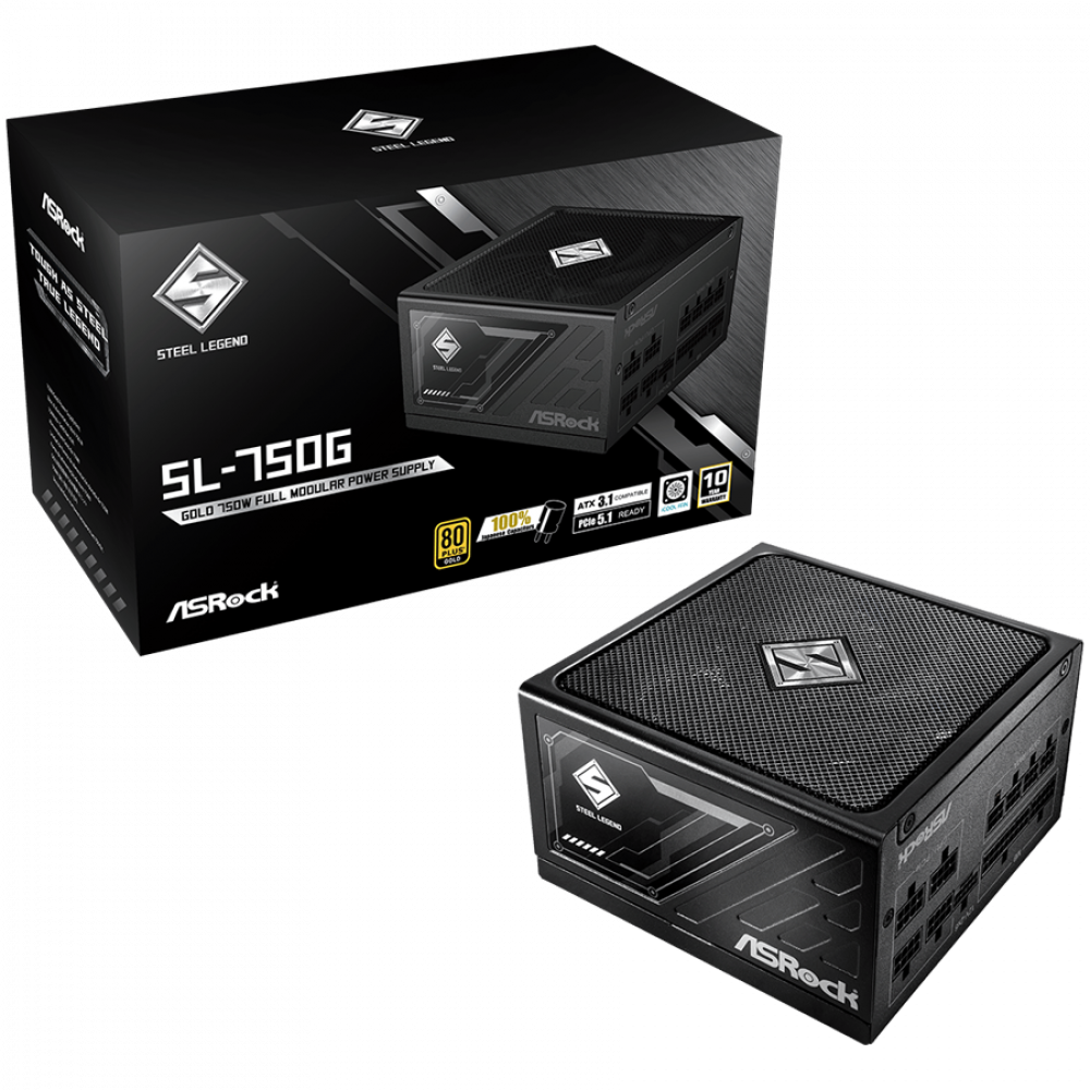 Asrock SL-750G, 750W, 80 Plus GOLD, Fully Modular PSU, Japanese Capacitors, 2x EPS 12V CPU(4+4pin), 1x PCIe5.1 (12+4pin), 3x PCIe (6+2pin), 3x 4-pin connectors, 9x SATA, OCP, SCP, OVP, UVP, OTP, OPP protections, 135 mm Axial Fan, ATX 3.1
