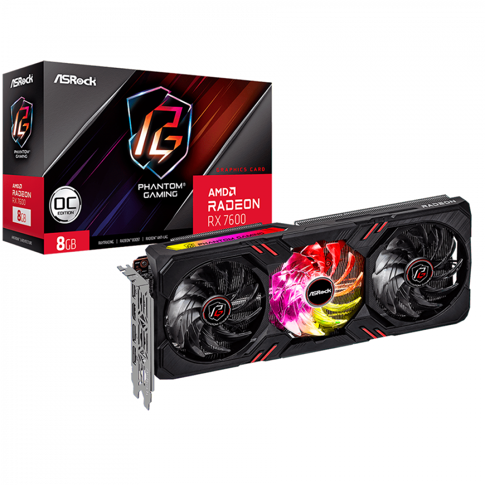 ASROCK Video Card AMD Radeon RX7600 Phantom Gaming 8GB OC, GDDR6, 128-bit, 3 x DisplayPort™ 2.1, 1 x HDMI™ 2.1, 3 x 8-pin Power Connectors, Recommended PSU 600W