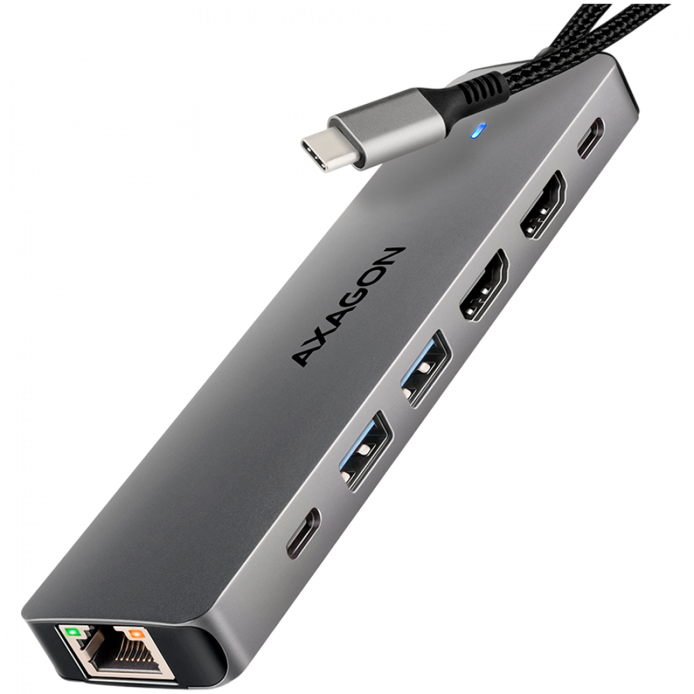 AXAGON HMC-7HX2 USB-C 3.2 Gen 1 hub, 2x USB-A + 1x USB-C, 2x HDMI 4K 60Hz, GLAN, PD 100W, 15cm USB-C cable