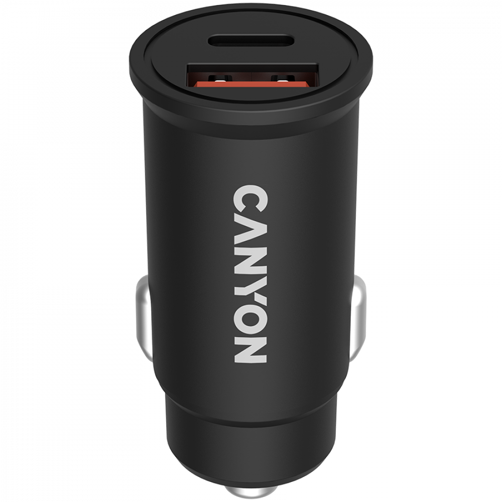 CANYON C-20B03, PD 30W/QC3.0 18W Pocket size car charger with 1-USB A+ 1-USB-C Input: DC12V-24V, Output: USBC: PD30W( 5V3A/9V3A/12V2.5A/15V2A/20V1.5A),USB-A:QC3.0 18W (5V3A