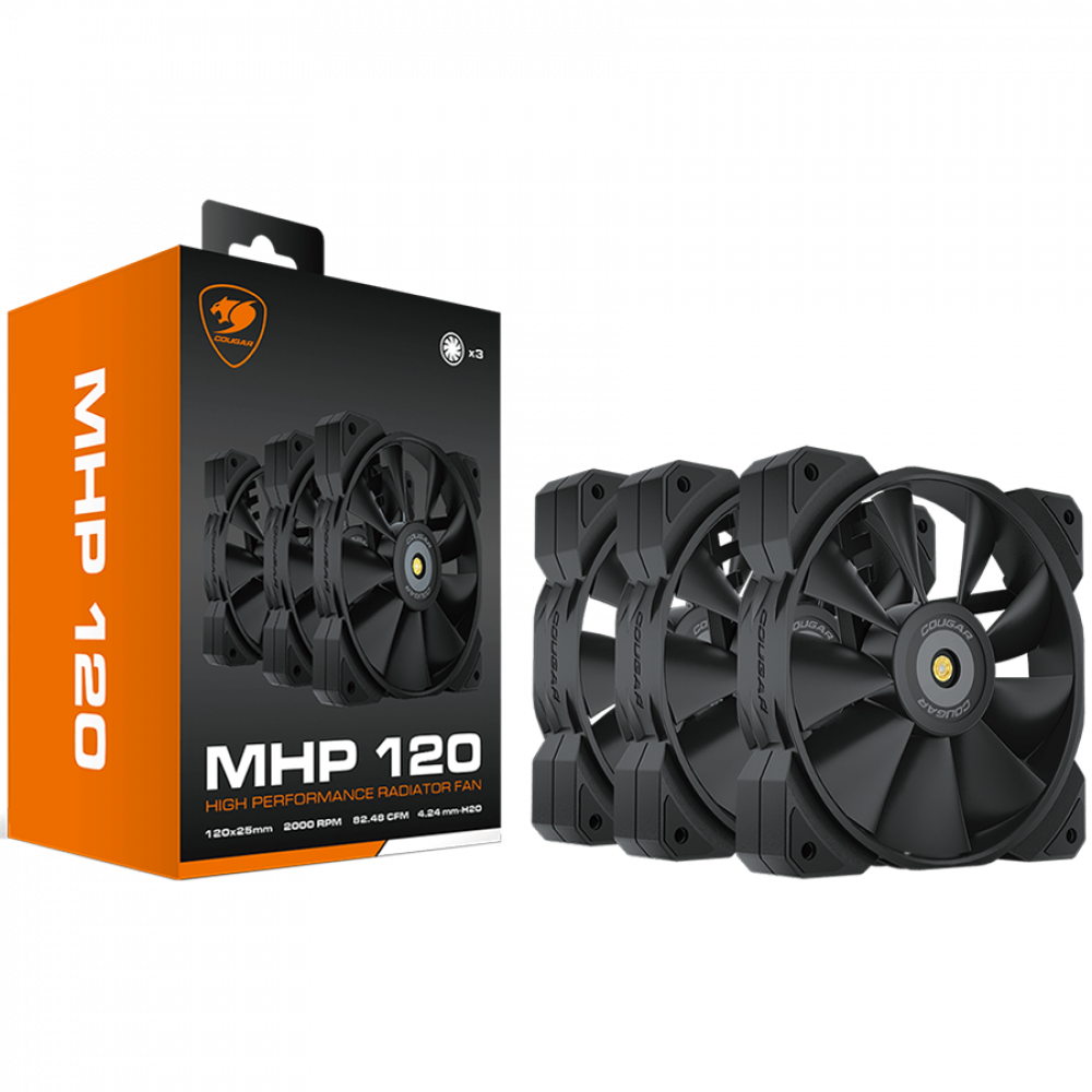 COUGAR MHP 120 Black (3 Fan Pack), 120mm 4-pin PWM fan, 600-2000RPM, HDB Bearing, Anti-vibration Dampers, Extension Cable + Low-Noise Adapter, Case + Radiator screws, 82.48 CFM, 4.24mm H20, 34.5 dBA (Max)