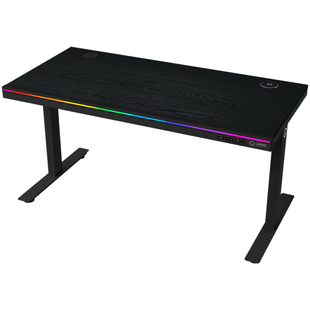 април 1, 2026Dual-motor sit/stand adjustable-height gaming desk with wireless charger, RGB lighting, control panel, and USB ports, PB melamine surface tabletop, black.