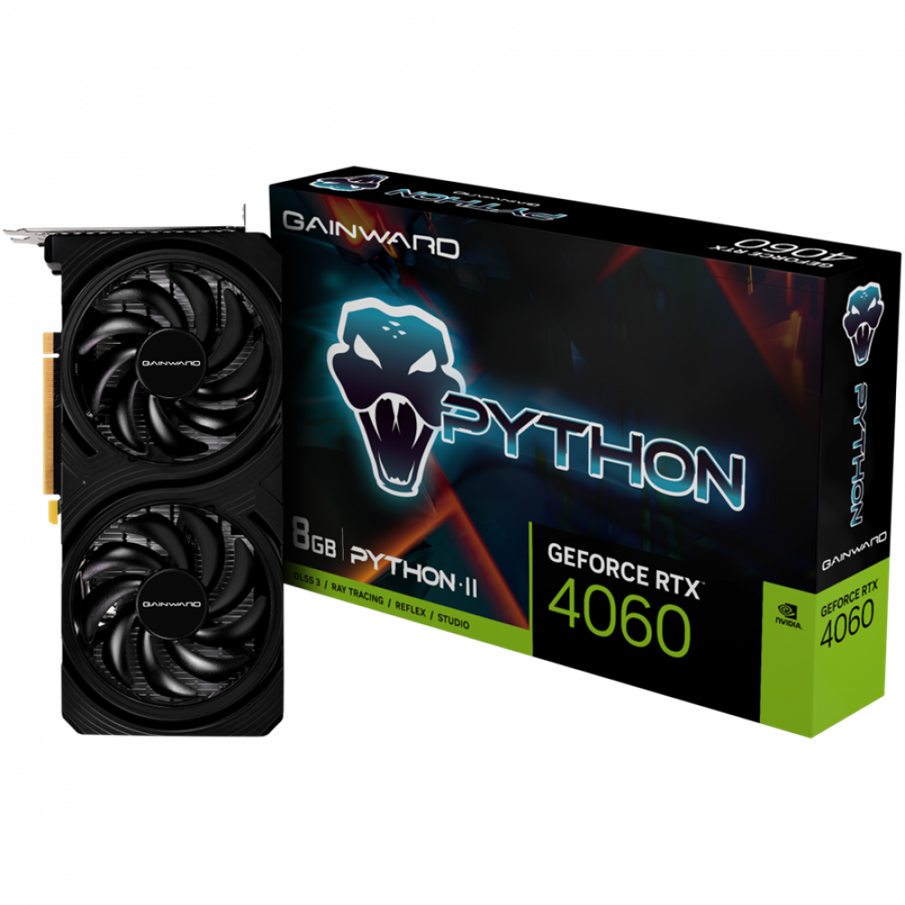 Gainward GeForce RTX 4060 Python II, 8GB GDDR6, 128bit, 1x HDMI 2.1, 3x DP 1.4a, two fan, 1x 8-pin Power connector, recommended PSU 600W, NE64060019P1-1070V