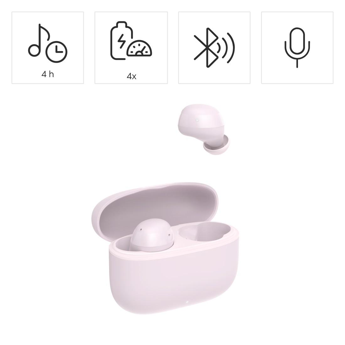 HAMA Блутут слушалки “Freedom Buddy II”, True Wireless, Розов Основни характеристики Тип: True Wireless Stereo (TWS), In-Ear Тегло: само 4 g на слушалка (общо 36 g с кейса) Драйвери: 10 mm Честотен диапазон (слушалки): 20 Hz – 20 kHz Чувствителност: 96 dB ± 3 dB Импеданс: 32 Ω Свързаност Bluetooth версия: 5.3, клас 2 Обхват: до 10 m Bluetooth профили: A2DP v1.3, AVRCP v1.5, HFP v1.5, SPP v1.0 Бързо сдвояване (QuickPair) Гласови асистенти: Apple Siri, Google Assistant Микрофон Тип: Вграден, всепосочен (Omnidirectional) Честотен диапазон: 100 Hz – 5 kHz Чувствителност: -40 dB ± 3 dB Функции: hands-free обаждания, voice control Функции и удобства Пасивна шумоизолация – чрез добър фит в ухото 3 еквалайзерни режима – усилен бас, подсилени високи или балансиран звук Сензорно управление (finger-touch) – контрол на музика/обаждания с докосване Силиконови накрайници – в 3 размера (S, M, L) за персонален комфорт Пряк достъп до Siri / Google Assistant Батерия и зареждане Макс. време за слушане: 4 h Време за разговори: 2.5 h Режим на готовност: до 200 h Зареждане: USB-C, около 2 h Кейсът осигурява 4 допълнителни зареждания