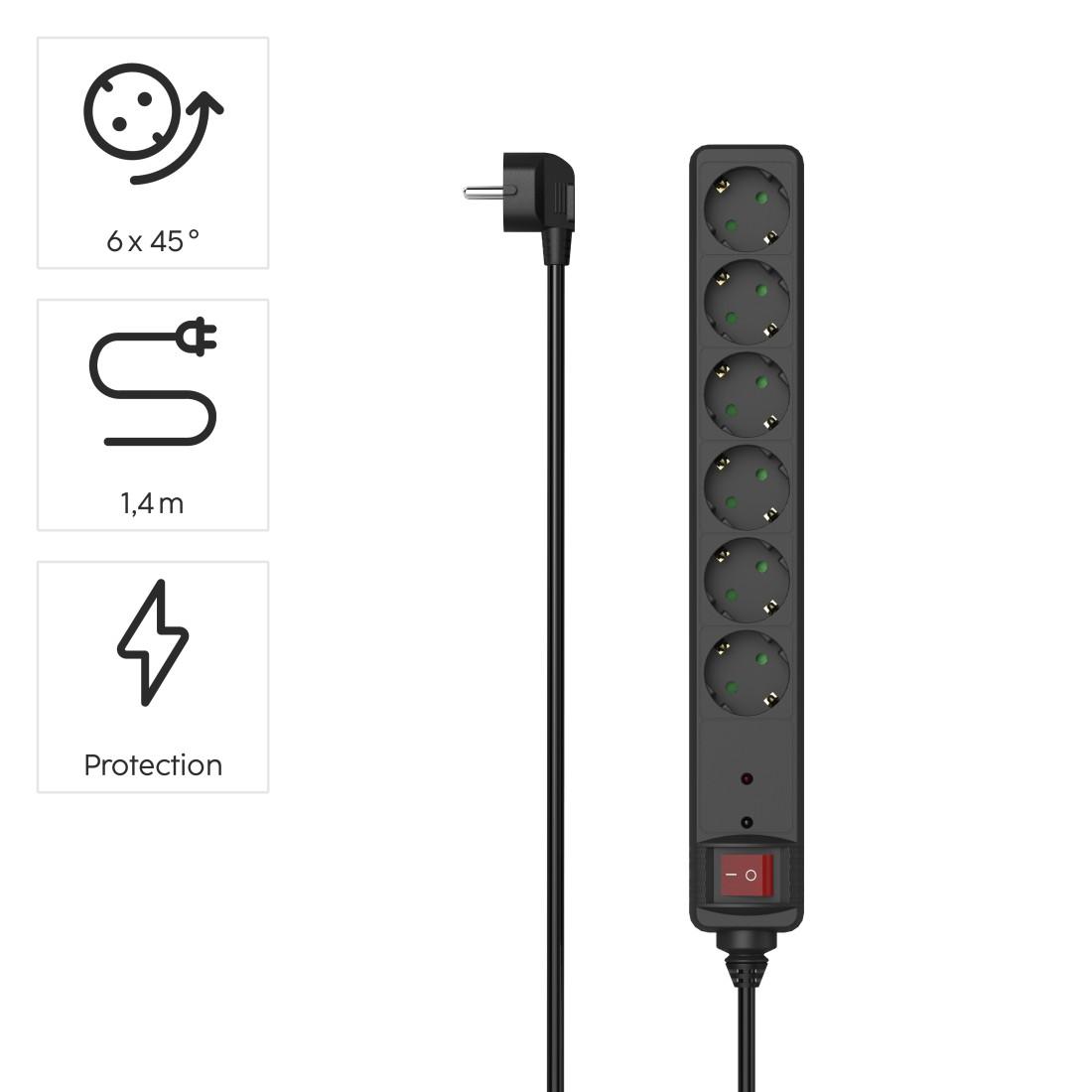 Разклонител със защита от пренапрежение , 6 гнeзда, 1.4м кабел черен – Защита на свързаните устройства срещу пренапрежение – Бутон за включване / изключване – Контакти, под ъгъл 45 – С функция за безопасност на децата Ако зелената контролна лампичка на разклонитела не свети след включване, контактът, към който е свързан разклонитела, не е заземен. Не свързвайте други устройства към контакта и се свържете с квалифициран електротехник. Ако червената контролна лампичка на защитата от пренапрежение НЕ свети след включване, това означава, че защитата от пренапрежение е изгоряла и свързаните устройства вече не са защитени.