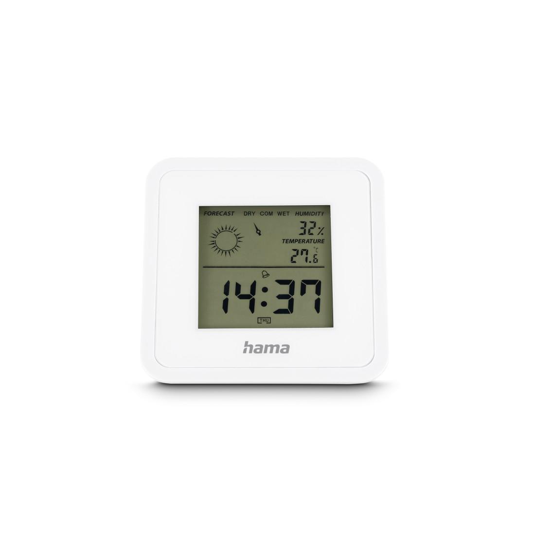 HAMA “Borneo” Дигитален часовник с цифров термометър/хигрометър, бял Прецизен термометър / хигрометър Функции: Алармена функция Индикатор за комфорт Памет за данни (макс./мин. стойности) Snooze функция Прогноза за времето Измервателни диапазони: Влажност на въздуха: 20% – 95% Температура (вътрешна/външна): 0°C до +50°C Дисплей: Цифров дисплей Показване на температурата (°C / °F – превключваемо) Памет за макс./мин. стойности Часовник / календар / аларма: Формат на часа: 12/24 h Дата и ден от седмицата Аларма + Snooze функция Хигрометър: Показване на тенденцията на влажността Подходящ за наблюдение на климатa в спални, детски стаи, дневни, зимни градини и оранжерии Характеристики: Монтаж: за поставяне (настолен) Материал: пластмаса Размери (Ш x Д x В): 8 × 1.2 × 8 cm Батерия: 1 × CR2032