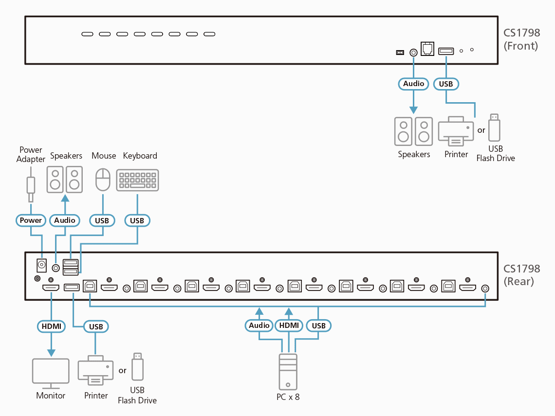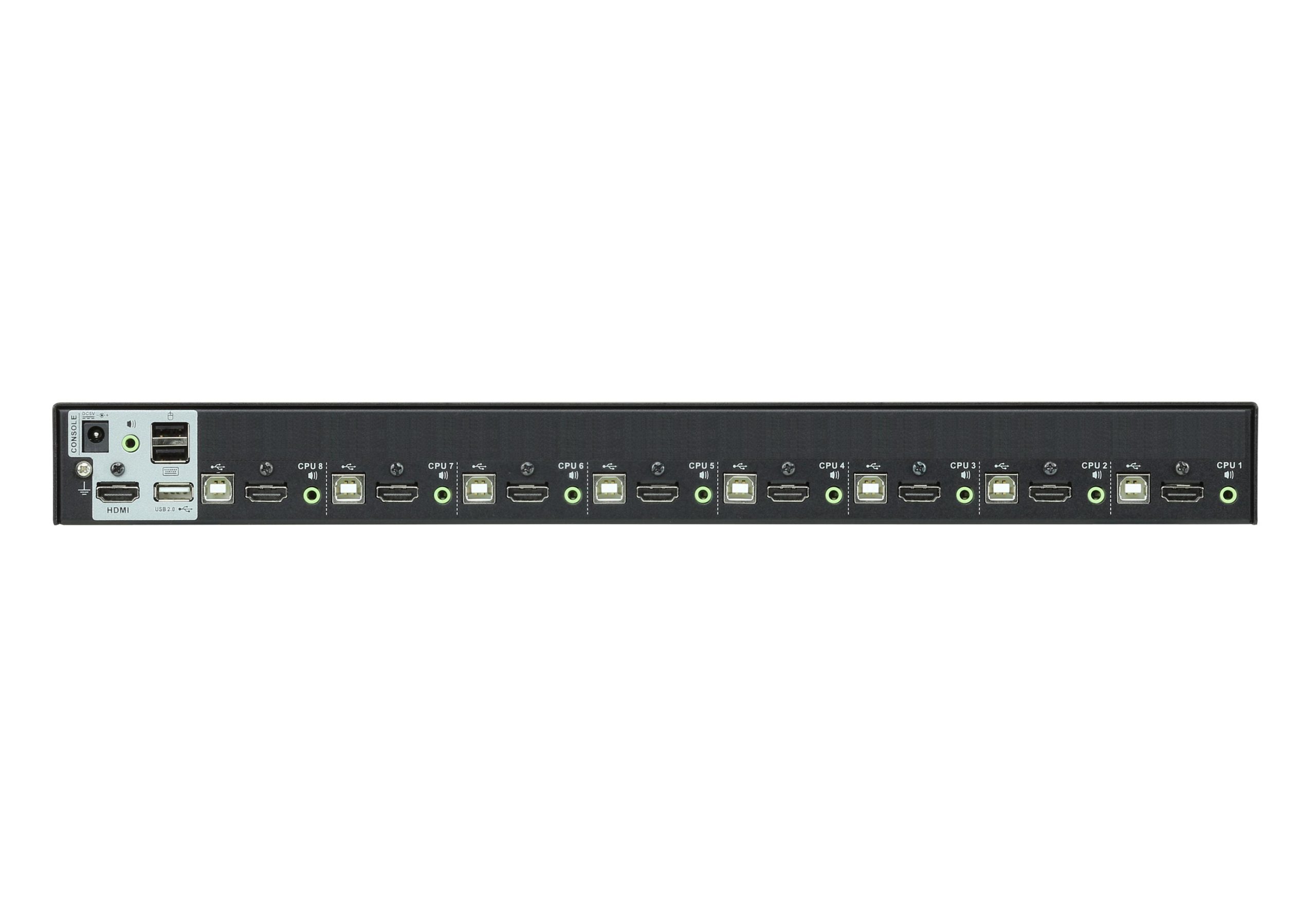 ATEN CS1798‑AT‑G – 8‑портов USB HDMI/Audio KVM суич Професионално решение за централизирано управление на до 8 HDMI‑базирани системи от една конзола, с възможност за каскадно разширяване до 512 машини. Подходящ за сървърни помещения, лаборатории, NOC/control rooms и среди, където е критично да се оптимизира пространството и да се намали кабелната сложност. Функционално описание ATEN CS1798‑AT‑G е 8‑портов USB HDMI/Audio KVM суич, който позволява управление на до осем компютъра чрез една конзола (HDMI монитор, USB клавиатура и USB мишка). Чрез каскадно свързване на до три нива могат да се управляват до 512 системи от един оператор. Устройството е проектирано за професионална rack‑mount интеграция (1U, метален корпус) и осигурява стабилна HDMI картина, надеждно превключване и мултиплатформена съвместимост. Основни предимства за професионална употреба Консолидирано управление – идеално за сървърни стаи, тестови лаборатории, control rooms и среди с множество машини. Multi‑Display режим – възможност за стекване на до 8 устройства, когато компютрите имат множество видео карти. Позволява едновременен преглед на множество системи. Стабилна HDMI картина – Video DynaSync™ елиминира проблеми при превключване и гарантира оптимална резолюция до 1920 × 1200 @ 60 Hz . Вграден USB 2.0 hub – за флаш памет, принтери и други периферни устройства, достъпни от активния компютър. Независимо превключване на KVM и USB фокус – позволява работа с периферия върху една машина, докато се наблюдава друга. Broadcast Mode – изпълнение на едновременни операции върху множество компютри (инсталации, ъпдейти, shutdown). OSD Backup/Restore – бързо възстановяване на конфигурации при подмяна или разширяване на системата. HDMI + Audio – поддръжка на 2.1‑канален звук с конзолни аудио портове на предния панел. Мултиплатформена поддръжка – Windows, Linux, Mac, Sun; поддръжка на специални клавиатури (Mac/Sun). Технически характеристики Основни данни Тип устройство: 8‑портов USB HDMI/Audio KVM суич, 1U, метален корпус Максимален брой управлявани компютри: Директно: 8 Каскадно (3 нива): до 512 Конзолни портове 1 × HDMI 2 × USB Type‑A (клавиатура/мишка) 2 × 3,5 mm аудио жак (слушалки/микрофон – преден/заден панел) KVM портове към компютри 8 × HDMI 8 × USB Type‑B 8 × 3,5 mm аудио жак USB Hub 2 × USB 2.0 Type‑A (преден и заден панел) Видео Поддържани резолюции: до 1920 × 1200 @ 60 Hz , 1080p Widescreen поддръжка HDMI и HDCP съвместимост Video DynaSync™ за оптимално превключване Управление и функции Избор на порт: OSD, hotkeys, бутони на панела Auto Scan режим с регулируем интервал: 1–255 s Broadcast Mode OSD Backup/Restore Независимо превключване на KVM и USB фокус Multi‑Display режим при стекване на устройства Аудио Поддръжка на 2.1‑канален звук Конзолни аудио портове на предния панел Платформи Windows, Linux, Mac, Sun Поддръжка на Mac/Sun клавиатури Размери и тегло Размери: приблизително 432,4 × 257,2 × 44 mm (Ш × Д × В) Височина: 1U Тегло: около 4,6 kg Захранване Вход: DC 5 V Консумация: приблизително 5,8–12 W