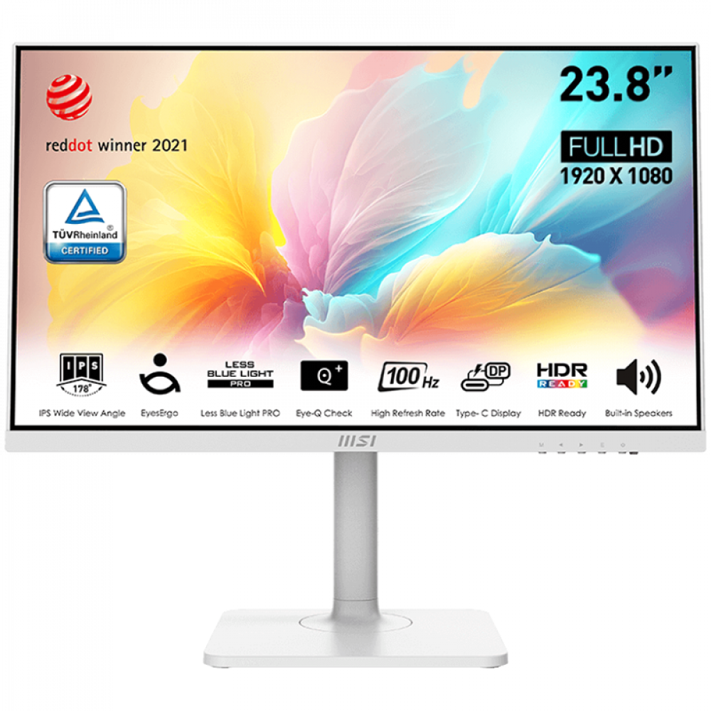 MSI MODERN MD2412PW Professional Business Monitor, 23.8″ 100Hz, FHD (1920×1080) 16:9, IPS Anti-glare, 1ms/4ms, 250nits, 1000:1, 178/178, Adaptive-Sync, HDR Ready, Adjustable Stand, Speakers, 1x HDMI, 1x Type-C, White, 3Y Warranty