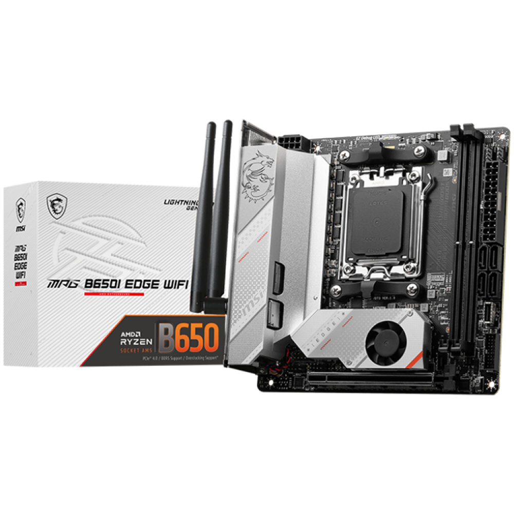 октомври 1, 2025MSI MPG B650I EDGE WIFI, m-ITX, Socket AM5, Dual Channel DDR5 6600+MHz (OC), 1x PCIe x16 slot, 2x M.2 slot, 1x HDMI, 3x USB 3.2 Gen 2, 2x USB 3.2 Gen 1, 1x USB 3.2 Gen2x2 Type C, 7.1 HD Audio, 2.5Gbps LAN, WIFI, BT, 3Y