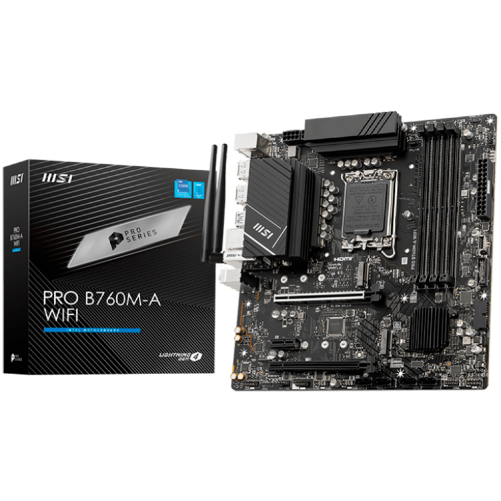 MSI PRO B760M-A WIFI, mATX, Socket 1700, Dual Channel 6800(OC)MHz, 2x PCIe x16 slots, 2x M.2 slots, 2x HDMI, 2x DP, 2x USB 3.2 Gen 2, 2x USB 3.2 Gen 1, 2x USB 2.0, 7.1 HD Audio, 2.5Gbps LAN, WI-FI 6E, BT, 3Y