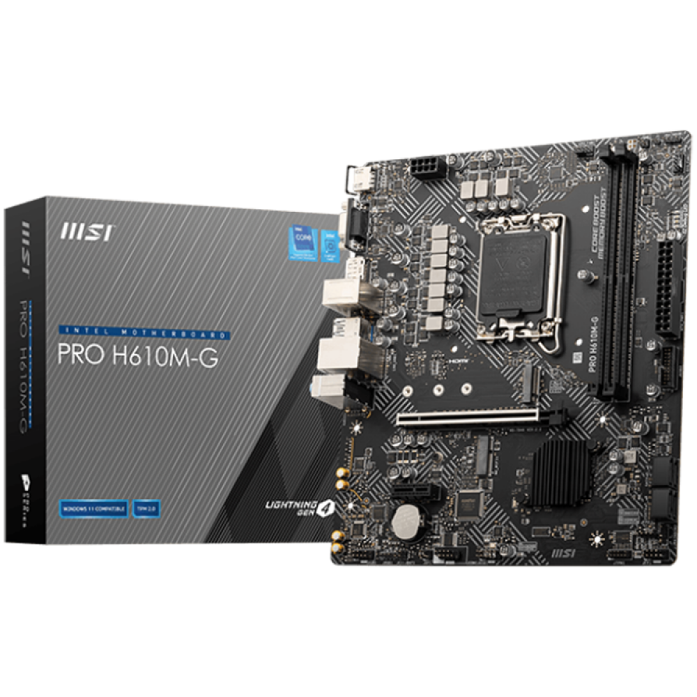 октомври 1, 2025MSI PRO H610M-G, mATX, LGA1700, Dual Channel DDR5 5600+MHz, 1x PCIe x16 slot, 1x M.2 slot, 1x HDMI, 1x VGA, 2x USB 3.2 Gen 1, 4x USB 2.0, 7.1 HD Audio, Realtek ALC897 Codec, 1G LAN, 3Y