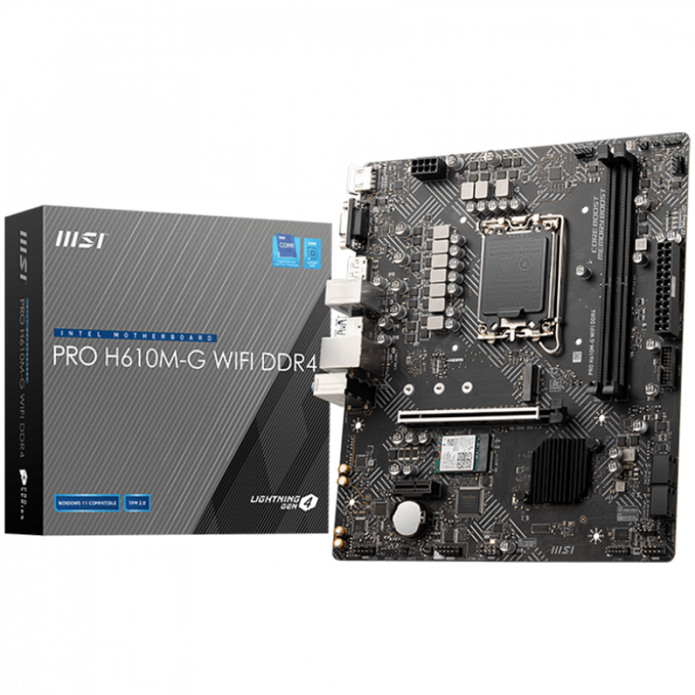 MSI PRO H610M-G WIFI DDR4, M-ATX, Socket 1700, Dual Channel 64GB 3200 MHz, 1x PCIe x16 slot, 1xPCIex1 slot, 1x HDMI, 1x DP, 1xM.2 slot, 4x USB 3.2 1.5Gbps, 6xUSB 2.0, 7.1 HD Audio, 1Gbps LAN, WI-FI 6E, BT, 3Y
