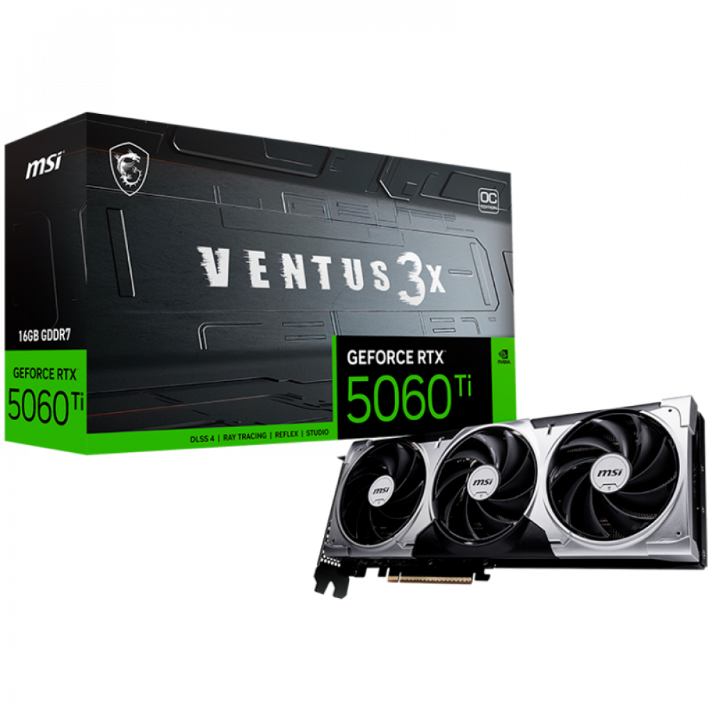 MSI Video Card NVIDIA GeForce RTX 5060 Ti 16G VENTUS 3X OC, 16GB GDDR7, 128-bit, 2617 MHz Boost, 4608 CUDA Cores, PCIe 5.0 (x8), 3x DP 2.1b, HDMI 2.1b, RAY TRACING, Triple Fan, 180W TDP, 8-pin PCIe Power, G-SYNC, 2-Slot, 3Y