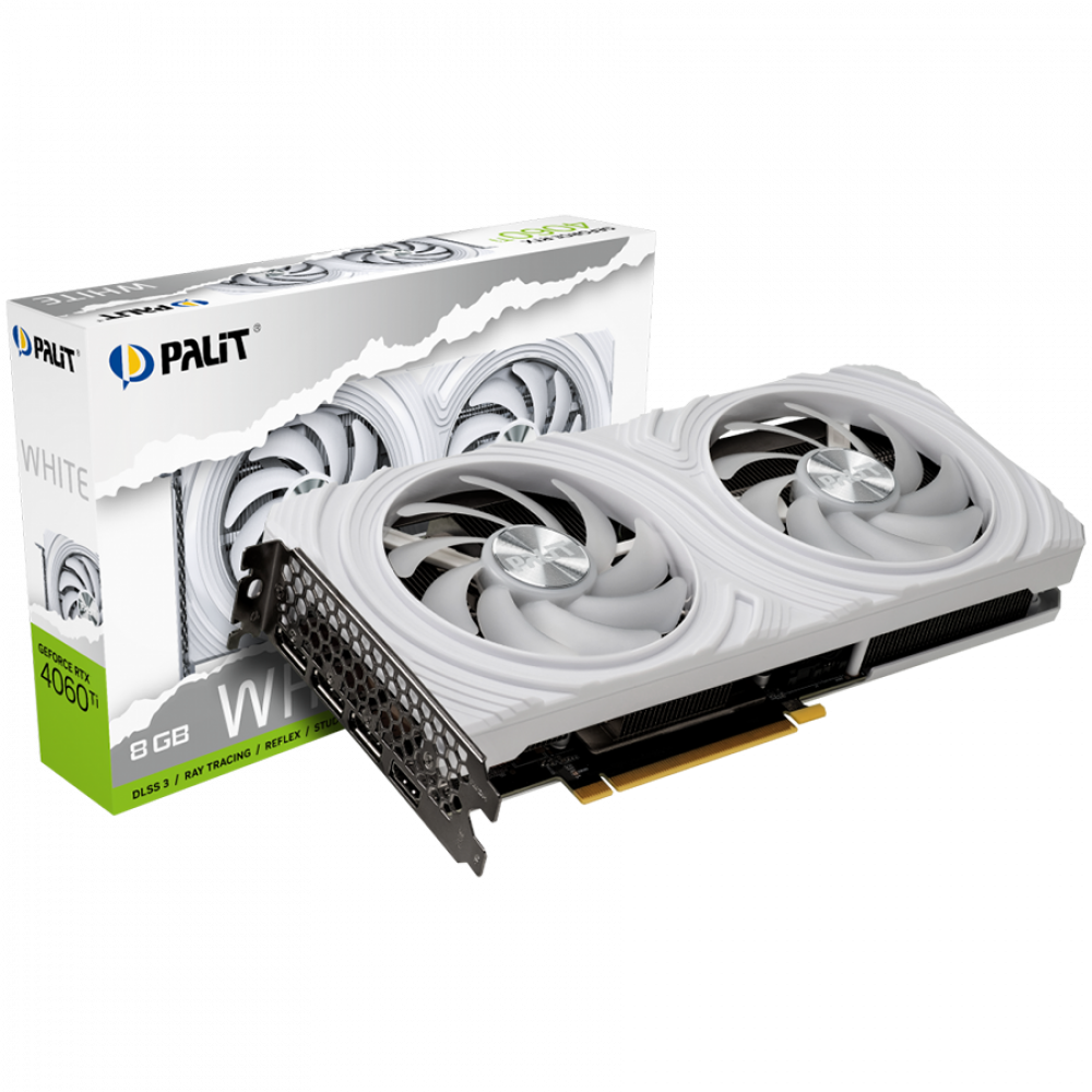 Palit RTX 4060Ti White 8GB GDDR6, 128 bits, 2310/2535 Mhz, 1x HDMI 2.1a, 3x DP 1.4a, two fan, 1x 8-pin Power connector, recommended PSU 650W, NE6406T019P1-1048L
