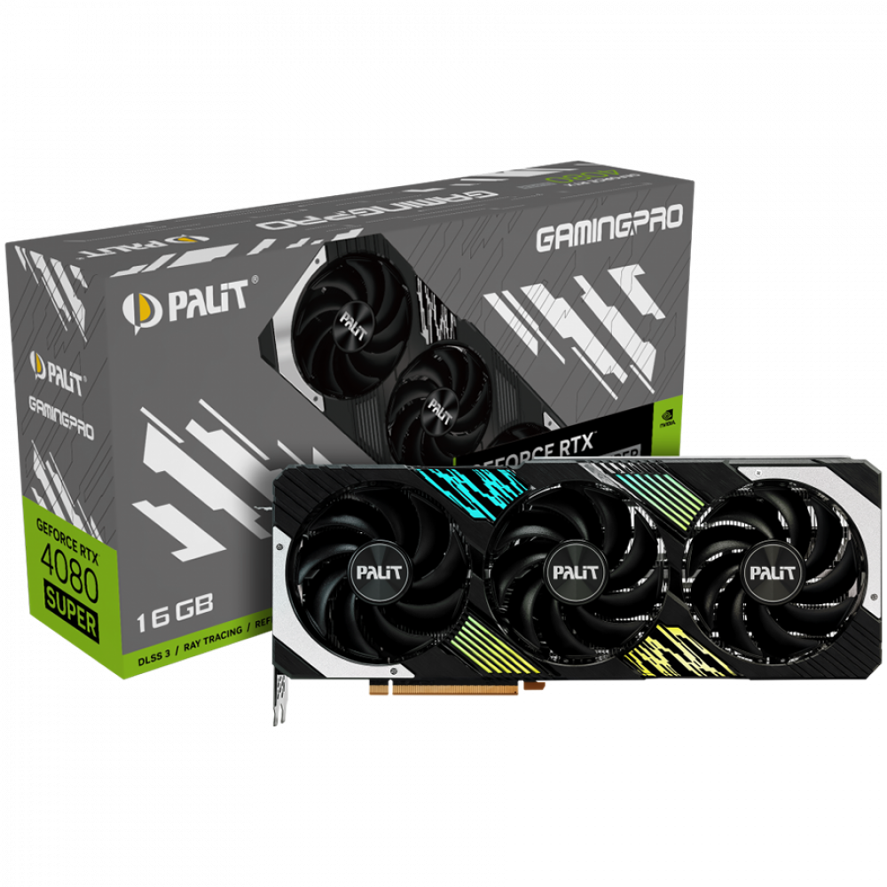 Palit RTX 4080 SUPER GamingPro, 16GB GDDR6X, 256 bit, 1x HDMI 2.1a, 3x DP 1.4a, 3 Fan, 1x 16-pin power connector, recommended PSU 850W, NED408S019T2-1032A