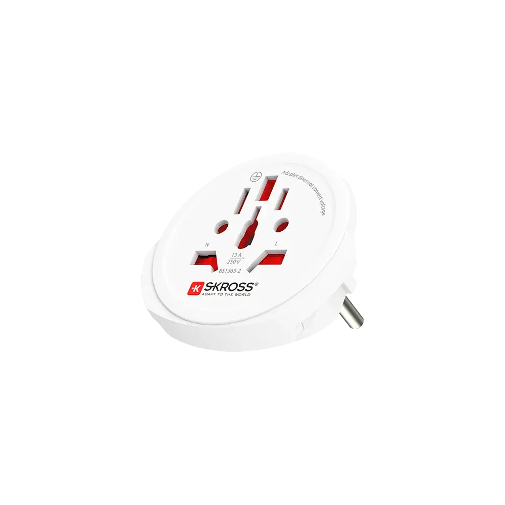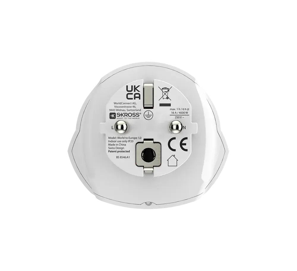 Инверторът SKROSS 1500211CE е универсален адаптер, предназначен за безопасно свързване на устройства с различни щепсели към европейски контакти тип E и F (Schuko). Той е проектиран в Швейцария и е подходящ за пътувания в над 150 държави, включително България. Основни характеристики: Входни щепсели: Поддържа устройства с 2- и 3-пинови щепсели от над 150 държави, включително типове A, B, C, I, G, J, L. Изходни контакти: Тип E и F (Schuko), използвани в повечето европейски държави. Максимален ток: 16 A при 250 V AC. Максимална мощност: До 4000 W при 250 V AC. Размери: 65 × 47 × 58 мм. Тегло: 45 г.