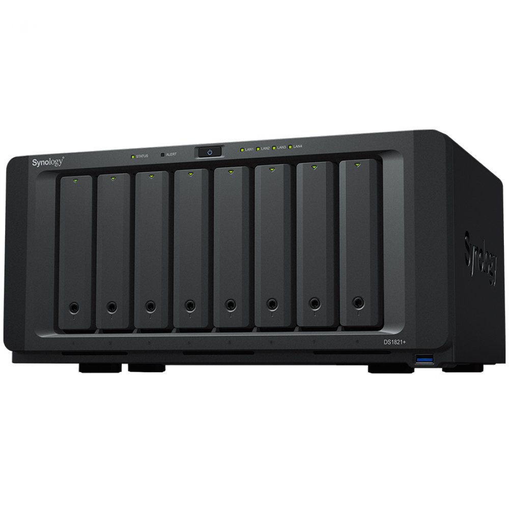Synology DiskStation DS1821+, Tower, 8-Bay 3.5” SATA HDD/SSD, 2 x M.2 2280 NVMe SSD, CPU AMD Ryzen Quad-core 2.2 GHz, 4 GB DDR4 ECC SODIMM, 4 x RJ-45 1GbE LAN, 4 x USB 3.2 Gen 1, 2 x eSATA (expandable to 15 with 2x DX517), 1 x PCIe Gen3 x8, 6kg,3y w