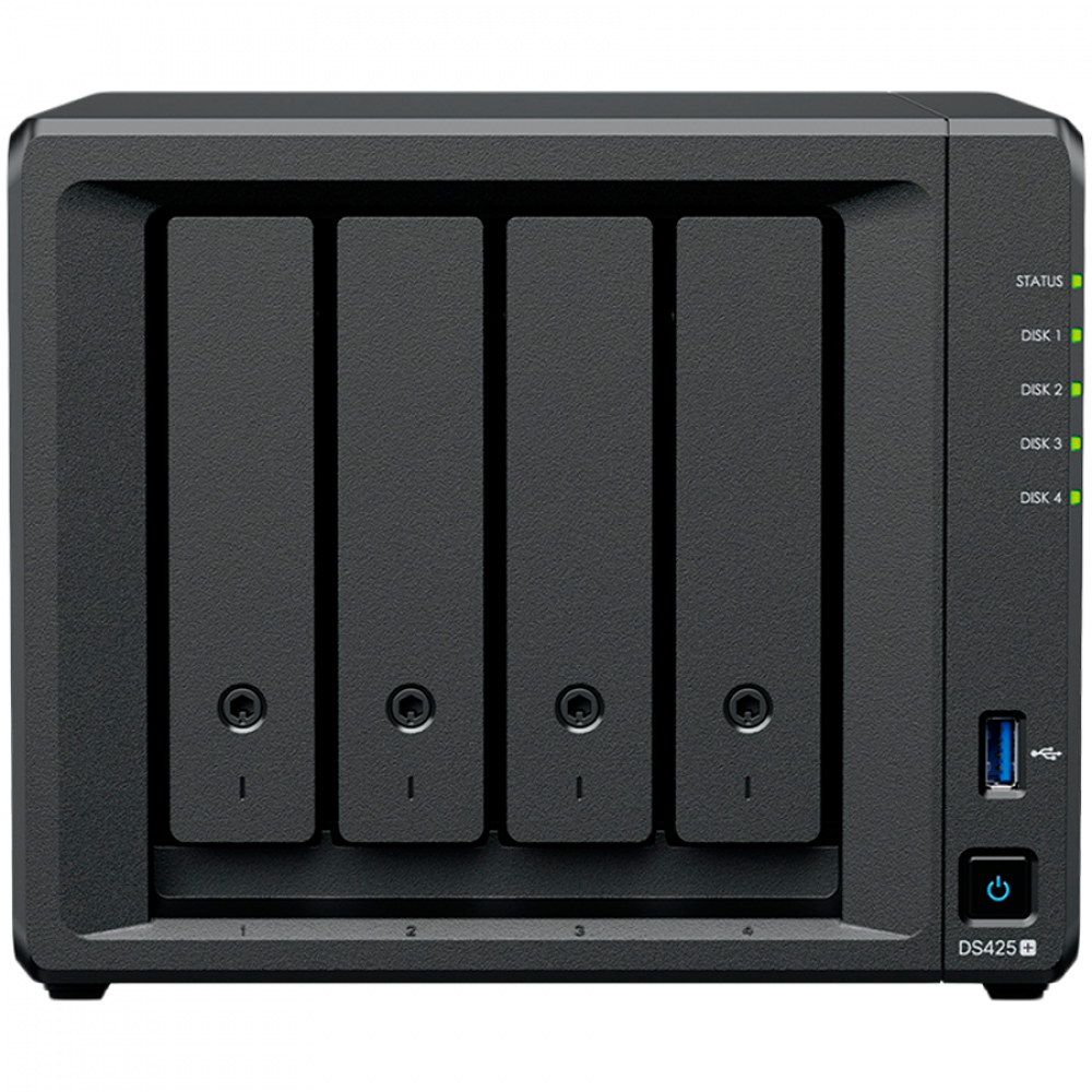 Synology DiskStation DS425+ Tower, 4-Bays 3.5” SATA HDD/SSD, 2 x M.2 2280 NVMe SSD slot, CPU Intel Celeron J4125 4-core 2.0 GHz, 2 GB DDR4 non-ECC SODIMM, 1x RJ-45 2.5 GbE LAN, 1x RJ-45 1GbE LAN Port; 2x USB 3.2; 2.18 kg; 3yr warranty