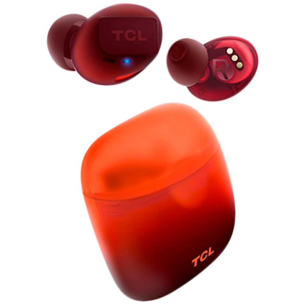 TCL In-Ear True Wireless Bluetooth Headset, Frequency of response 9-22K, Sensitivity 100 dB, Driver Size 5.8mm, Impedence 13 Ohm, Max power input 20mW, Playtime 6.5h/26h, IPX4, Bluetooth 5.0, A2DP, AVRCP, HFP, HS, USB-C, Color Sunset Orange