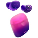 TCL In-Ear True Wireless Bluetooth Headset, Frequency of response 9-22K, Sensitivity 100 dB, Driver Size 5.8mm, Impedence 13 Ohm, Max power input 20mW, Playtime 6.5h/26h, IPX4, Bluetooth 5.0, A2DP, AVRCP, HFP, HS, USB-C, Color Sunrise Purple