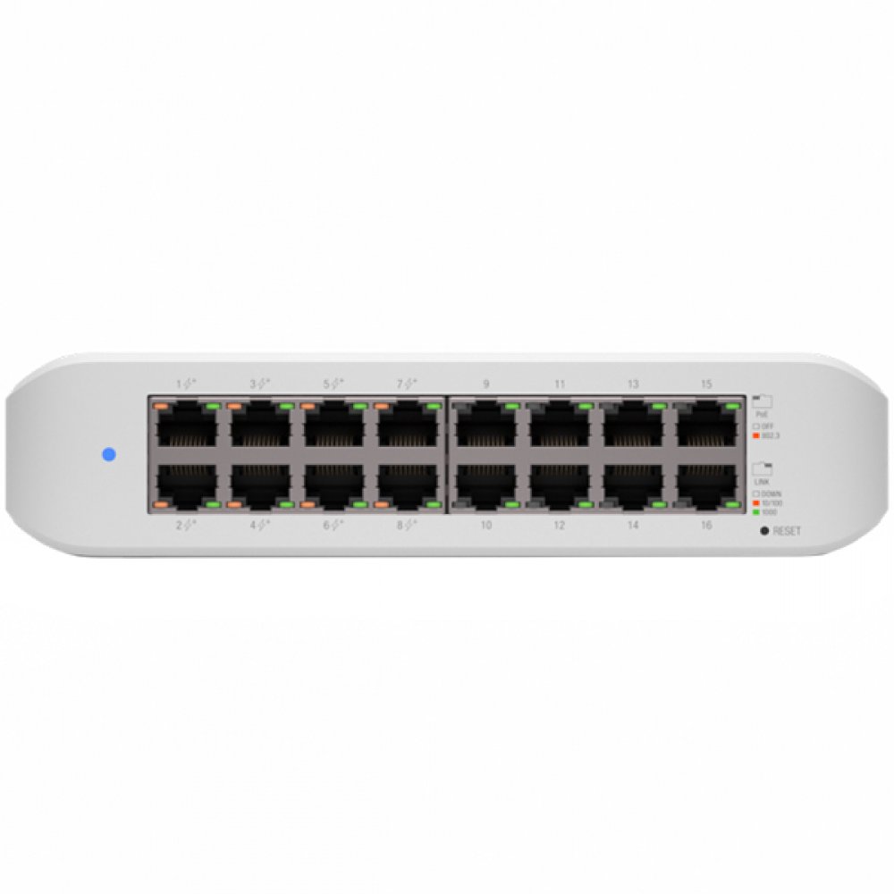UBIQUITI Lite 16 PoE; (8) GbE PoE+, (8) GbE ports; 45W total PoE availability; Wall mountable.