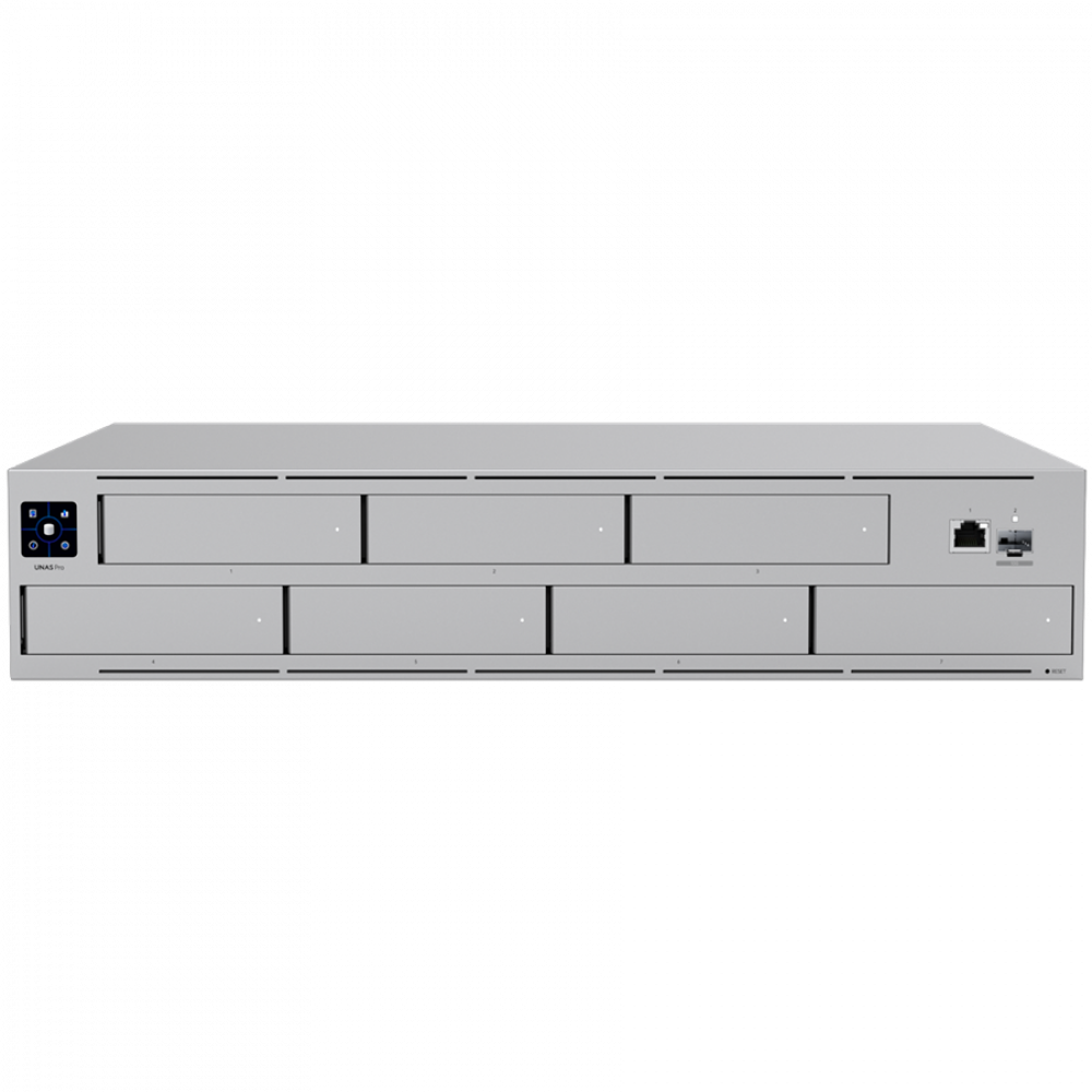 Ubiquiti UNAS-Pro-EU 2U rack-mount NAS with (7) 2.5/3.5″ drive bays and 10 Gbps performance designed for large-scale file storage and sharing, (7) 2.5/3.5″ HDD / SSD support, 10G SFP+ uplink and (1) GbE RJ45 port